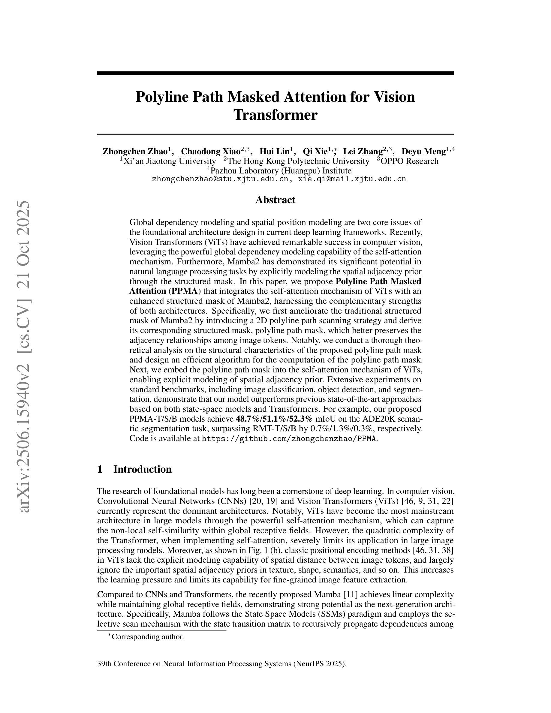 本文提出将Vision Transformer与Mamba2的结构化掩码结合的Polyline Path Masked Attention(PPMA)。通过引入2D折线路径扫描策略改进Mamba2的结构化掩码,形成Polyline Path Mask,更好地保留图像标记间的邻接关系。将此掩码嵌入Vision Transformer的自注意力机制中,实现对空间邻接关系的显式建模。在图像分类、目标检测和分割等标准基准测试上,该模型超越了基于状态和变换器的最新方法。