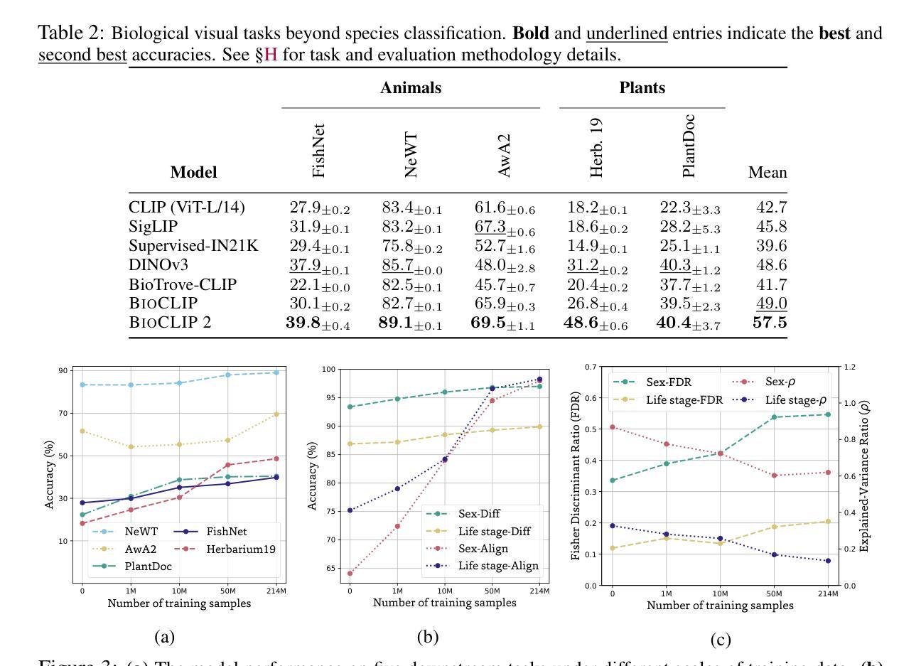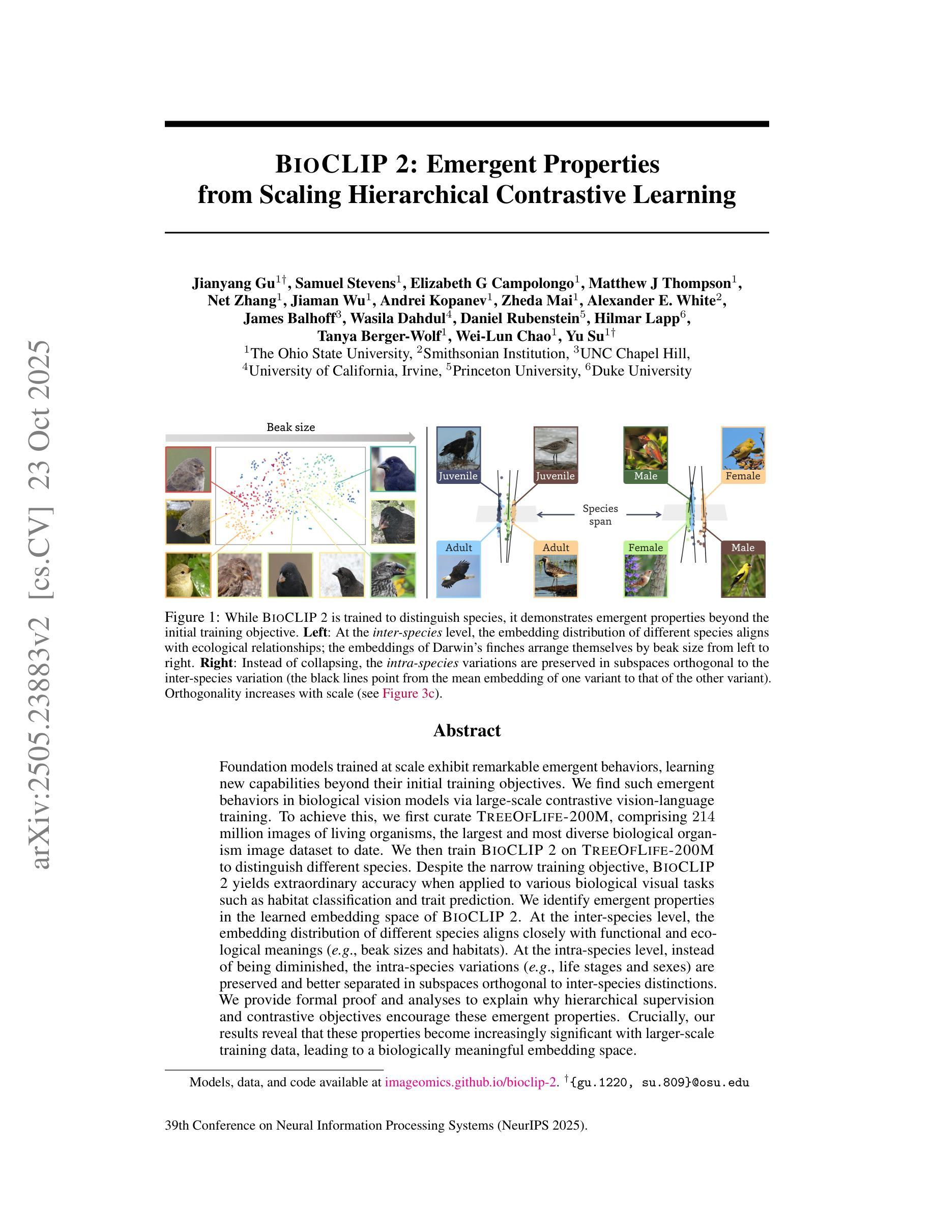 大规模训练的模型展现出显著的涌现行为,这些行为超越了其初始训练目标,学习到了新的能力。我们在通过大规模对比视觉语言训练的生物视觉模型中发现了这样的涌现行为。为此,我们首先整理了TreeOfLife-200M数据集,其中包含2.14亿个生物体图像,是目前为止最大且最多元的生物体图像数据集。然后我们在TreeOfLife-200M数据集上训练BioCLIP 2以区分不同的物种。尽管训练目标较为单一,但BioCLIP 2在应用于各种生物视觉任务(如栖息地分类和特征预测)时表现出惊人的准确性。我们在BioCLIP 2的嵌入空间中确定了涌现特性。在物种间层面,不同物种的嵌入分布与功能和生态意义紧密对齐(例如,喙的大小和栖息地)。在物种内部层面,物种内的变化(如生命阶段和性别)并未被削弱,而是在与物种间差异的正交子空间中得以保留并更好地分离。我们提供正式证明和分析来解释为什么层次化监督和对比目标会促进这些涌现特性。关键的是,我们的结果表明,随着训练数据规模的增加,这些特性变得越来越重要,从而形成一个具有生物学意义的嵌入空间。