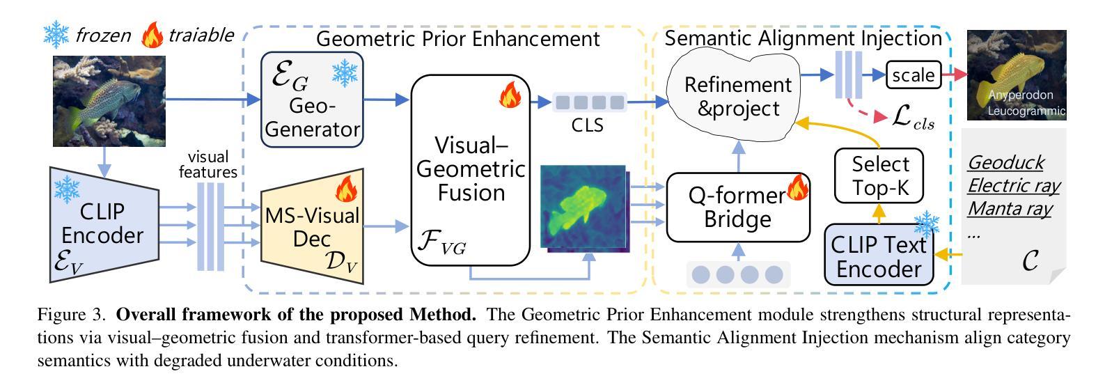现有的大多数水下实例分割方法受到封闭词汇预测的限制,无法识别新的海洋类别。为了支持评估,我们引入了\textbf{MARIS}(\underline{Mar}ine Open-Vocabulary \underline{I}nstance \underline{S}egmentation),这是水下开放词汇(OV)分割的第一个大规模精细基准测试,特点是有限的已知类别和多样的未知类别。虽然在自然图像上,开放词汇分割显示出了一定的前景,但我们的分析表明,转移到水下场景会受到严重的视觉退化(例如,颜色衰减)和语义不对准的影响,这是由于缺乏水下类别的定义所导致的。为了解决这些问题,我们提出了一个统一的框架,包含两个互补的组件。几何先验增强模块(\textbf{GPEM})利用稳定的部分级别和结构线索来保持对象在退化视觉条件下的一致性。语义对齐注入机制(\textbf{SAIM})丰富了语言嵌入的特定领域先验知识,减轻了语义模糊,提高了对未见类别的识别能力。实验表明,我们的框架在MARIS上无论是内部还是跨域设置都优于现有的OV基线,为未来水下感知研究奠定了坚实基础。
