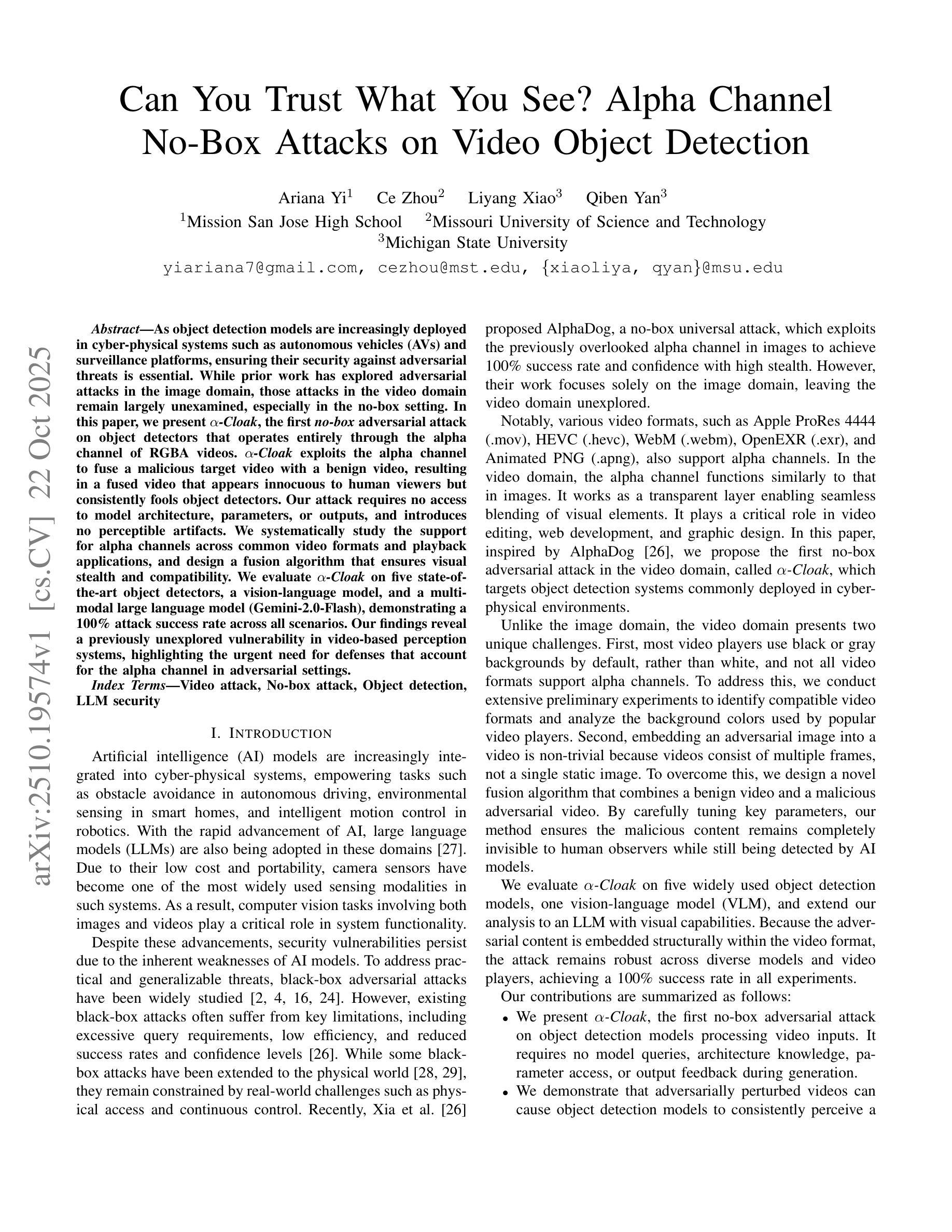 针对对象检测模型在自主车辆和监控平台等网络物理系统中的部署,本论文提出了名为{\alpha}-Cloak的无框视频域对抗攻击方法。通过利用RGBA视频的Alpha通道融合恶意目标视频与良性视频,该方法创造出看似无害的融合视频,欺骗对象检测器。攻击无需接触模型架构、参数或输出,且不引入可见失真。系统研究了常见视频格式和播放应用程序对Alpha通道的支持,并设计了确保视觉隐蔽性和兼容性的融合算法。评估显示,{\alpha}-Cloak在所有场景下攻击成功率达百分之百,揭示了视频感知系统中新的安全隐患,凸显需要迫切为对抗性设置中的Alpha通道进行防御工作。