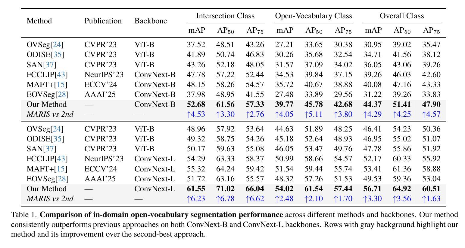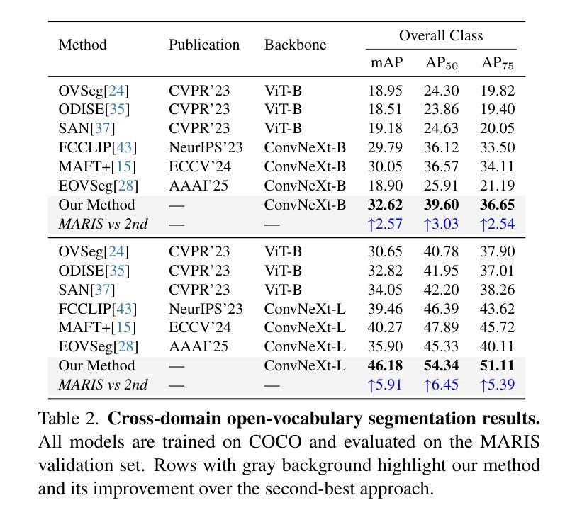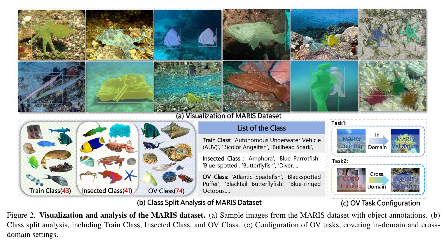 - 引入了首个大规模水下开放词汇分割基准MARIS,包含有限的已知类别和多样的未知类别。