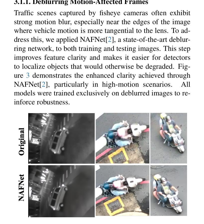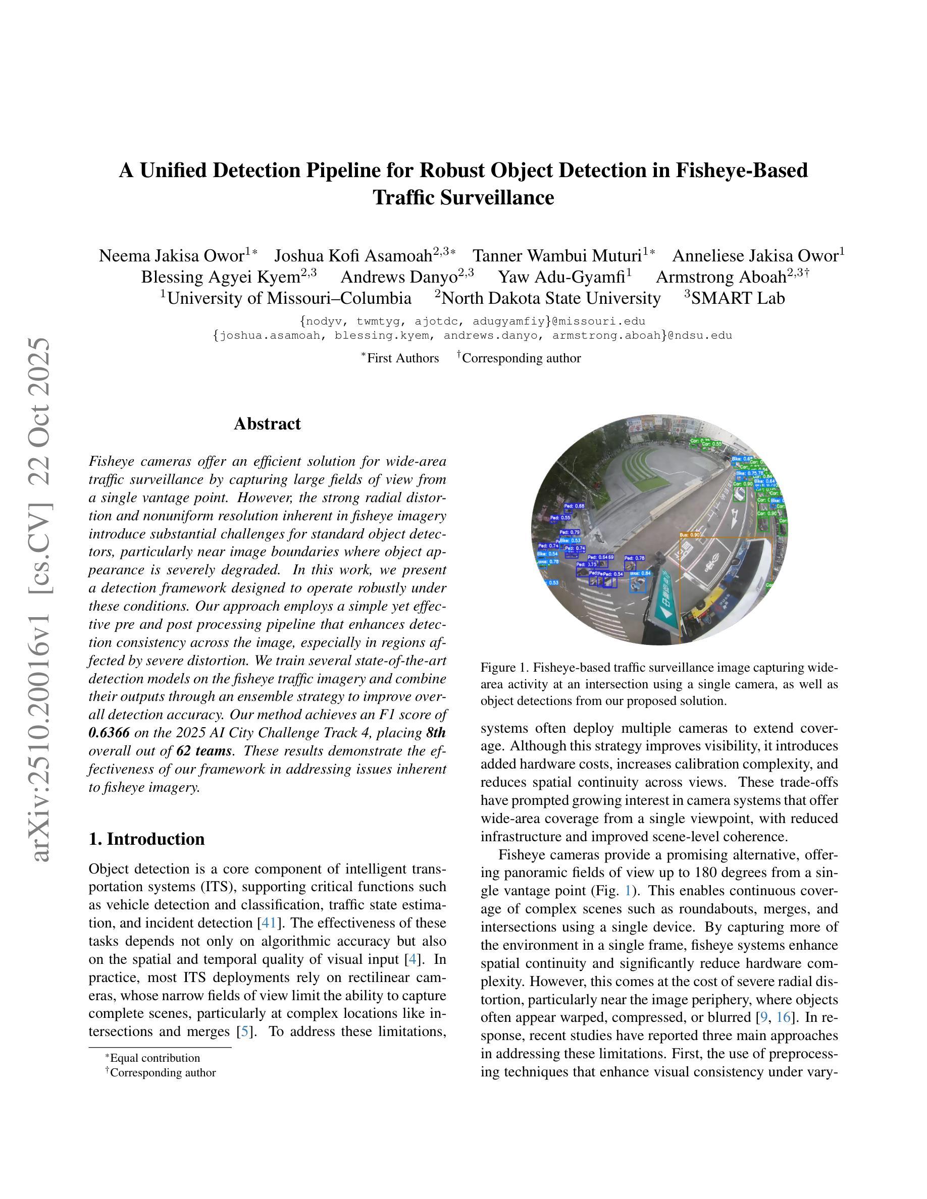 鱼眼相机通过从一个有利的位置捕获较大的视野,为宽区域交通监控提供了有效的解决方案。然而,鱼眼图像固有的强烈径向失真和非均匀分辨率给标准目标检测器带来了巨大的挑战,特别是在图像边界附近,目标外观严重退化。在这项工作中,我们提出了一种在这些条件下稳健运行的目标检测框架。我们的方法采用简单有效的预处理和后处理管道,提高了图像中检测的稳定性,特别是在受严重失真影响的区域。我们在鱼眼交通图像上训练了多个最先进的检测模型,并通过集成策略结合了它们的输出,以提高总体检测精度。我们的方法在2025年智能城市挑战赛第四赛道上取得了F1分数为0.6366的成绩,在62支队伍中排名第8。这些结果证明了我们的框架在解决鱼眼图像固有问题的有效性。