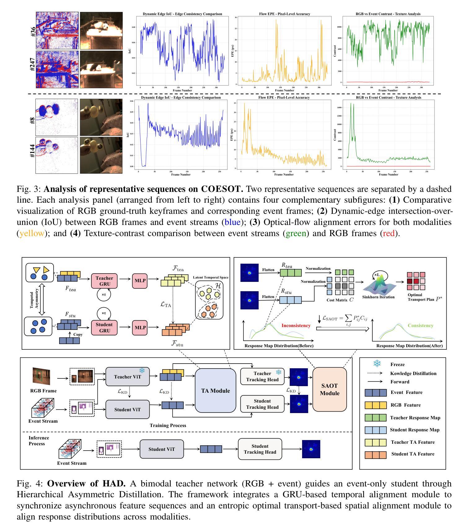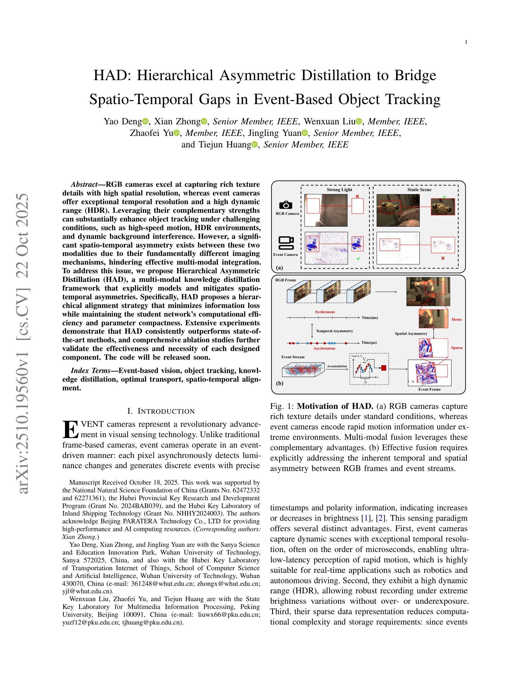 RGB相机擅长捕捉丰富的高空间分辨率纹理细节,而事件相机则提供出色的时间分辨率和高动态范围(HDR)。利用它们的互补优势,可以在高速运动、HDR环境和动态背景干扰等挑战条件下,大幅增强目标跟踪性能。然而,由于它们根本的成像机制不同,这两种模式之间存在显著的空间时间不对称性,阻碍了有效的多模式融合。为了解决这一问题,我们提出了{分层不对称蒸馏}(HAD),这是一种多模式知识蒸馏框架,能够显式地建模并缓解时空不对称性。具体来说,HAD提出了一种分层对齐策略,在保持学生网络计算效率和参数紧凑性的同时,最小化信息损失。大量实验表明,HAD持续优于最新方法,综合消融研究进一步验证了每个设计组件的有效性和必要性。代码很快会发布。