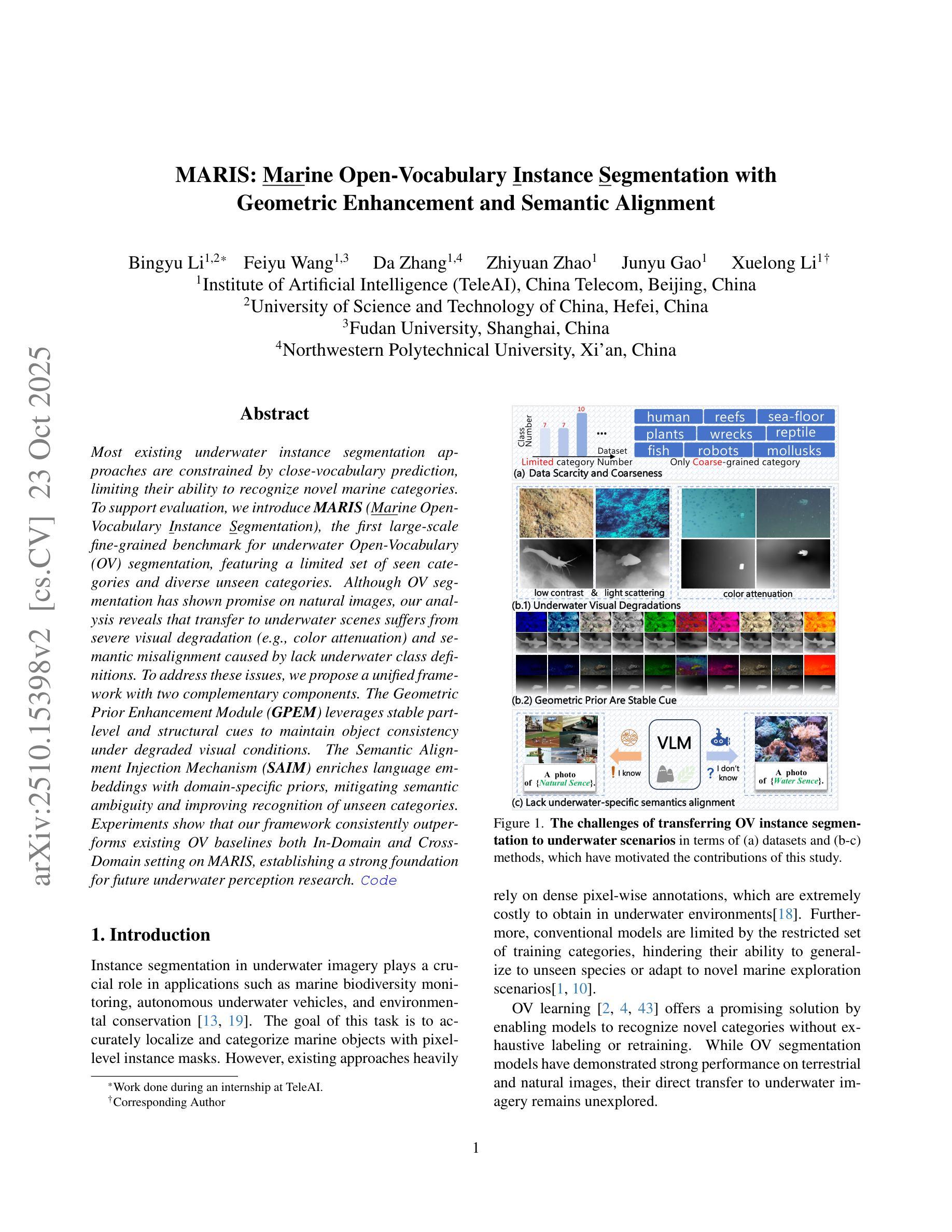 本文介绍了水下开放词汇实例分割的新挑战,并引入了首个大规模水下开放词汇分割基准MARIS。现有方法在水下场景中的迁移面临视觉退化和语义不对齐的问题。为此,提出了一个统一框架,包括几何先验增强模块和语义对齐注入机制,以提高对象的一致性和对未见类别的识别能力。在MARIS上的实验表明,该方法在域内和跨域设置下均优于现有开放词汇基线,为未来水下感知研究奠定了坚实基础。