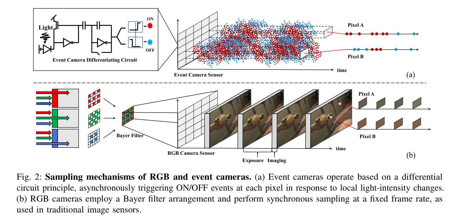 - RGB相机和事件相机各有优势:RGB相机捕捉丰富纹理细节和高空间分辨率,事件相机提供出色的时间分辨率和高动态范围(HDR)。