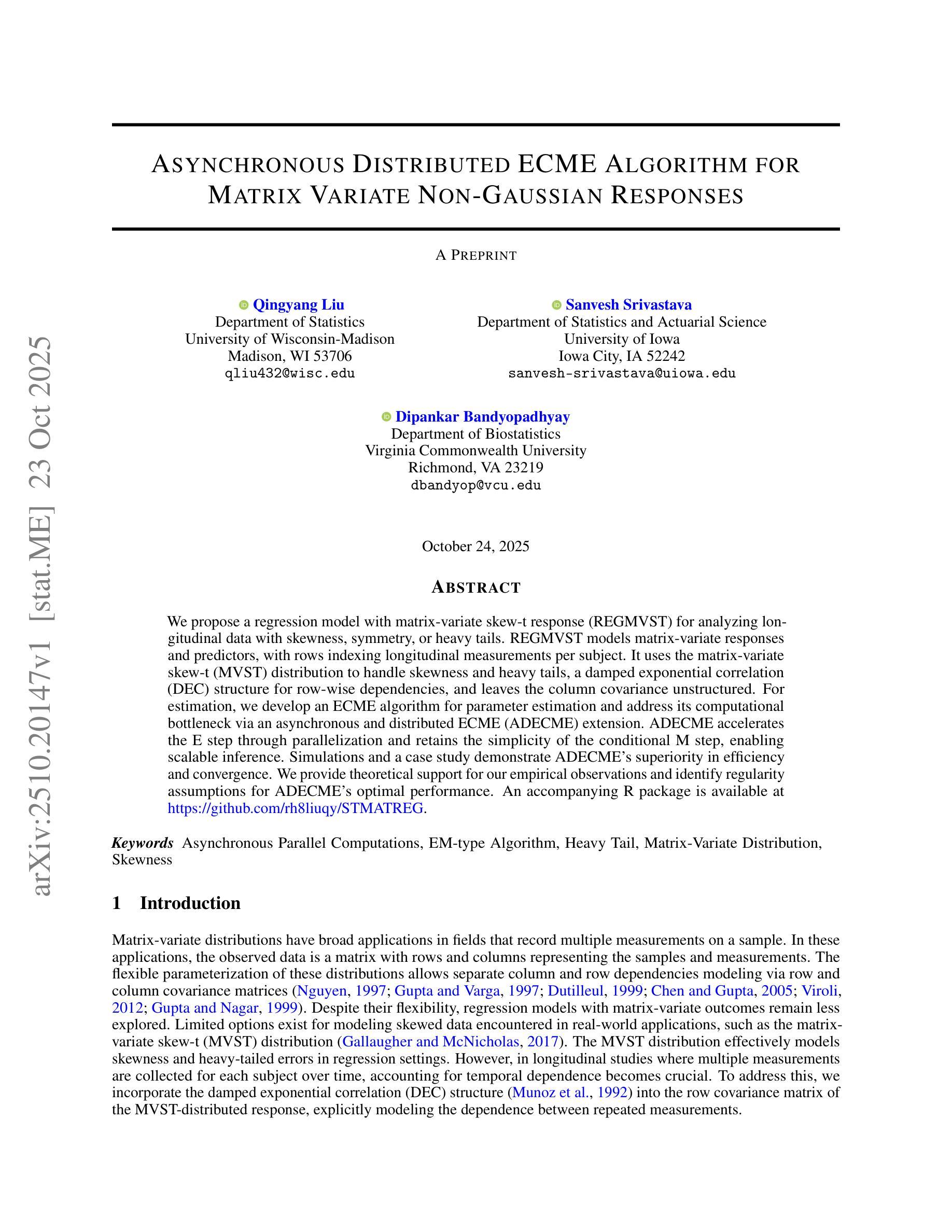 提出一种基于矩阵变量偏t分布的回归模型(REGMVST),用于分析具有偏斜、对称或重尾特性的不规则纵向数据。REGMVST模型对矩阵变量响应和预测变量进行建模,行索引为每主体的纵向测量值。它采用矩阵变量偏t(MVST)分布来处理偏斜和重尾数据,使用阻尼指数相关性(DEC)结构来刻画行间的依赖关系,并假设列协方差不受结构影响。为参数估计,初步开发ECME算法,并通过异步分布式ECME(ADECME)扩展进一步缓解其计算瓶颈。ADECME通过并行化加速E步,同时保留条件M步的简洁性,从而实现可扩展的推理。使用合成数据和电子健康记录中的矩阵变量牙周病终点的案例研究表明,ADECME在效率和收敛性方面优于其他方法。我们还为经验观察提供了理论支持,并为ADECME的最佳性能提供了规律性假设。相应的R包可在https://github.com/rh8liuqy/STMATREG获取。