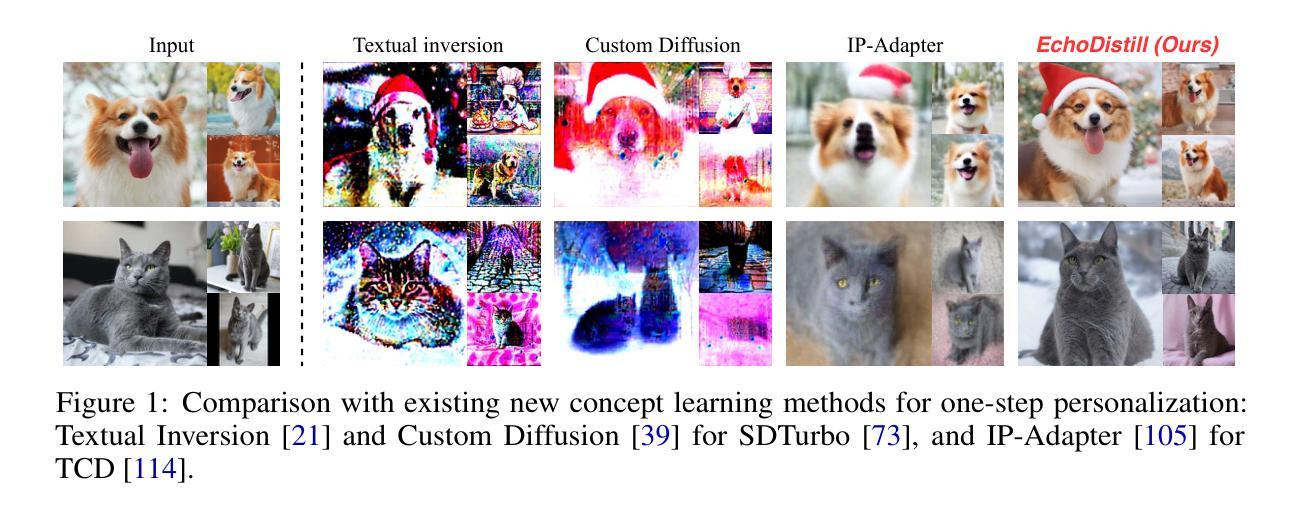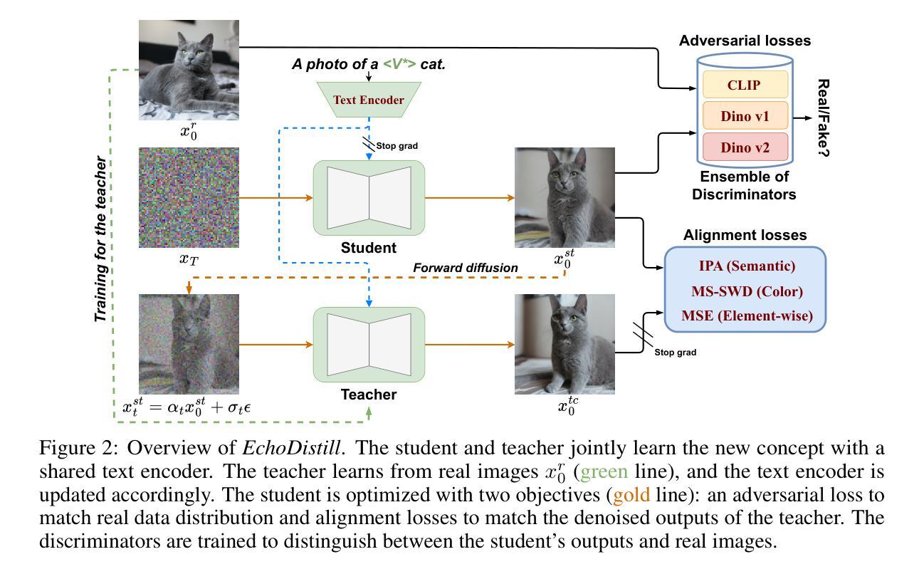 - 提出了EchoDistill双向概念蒸馏框架,用于加速文本到图像(T2I)扩散模型的个性化。