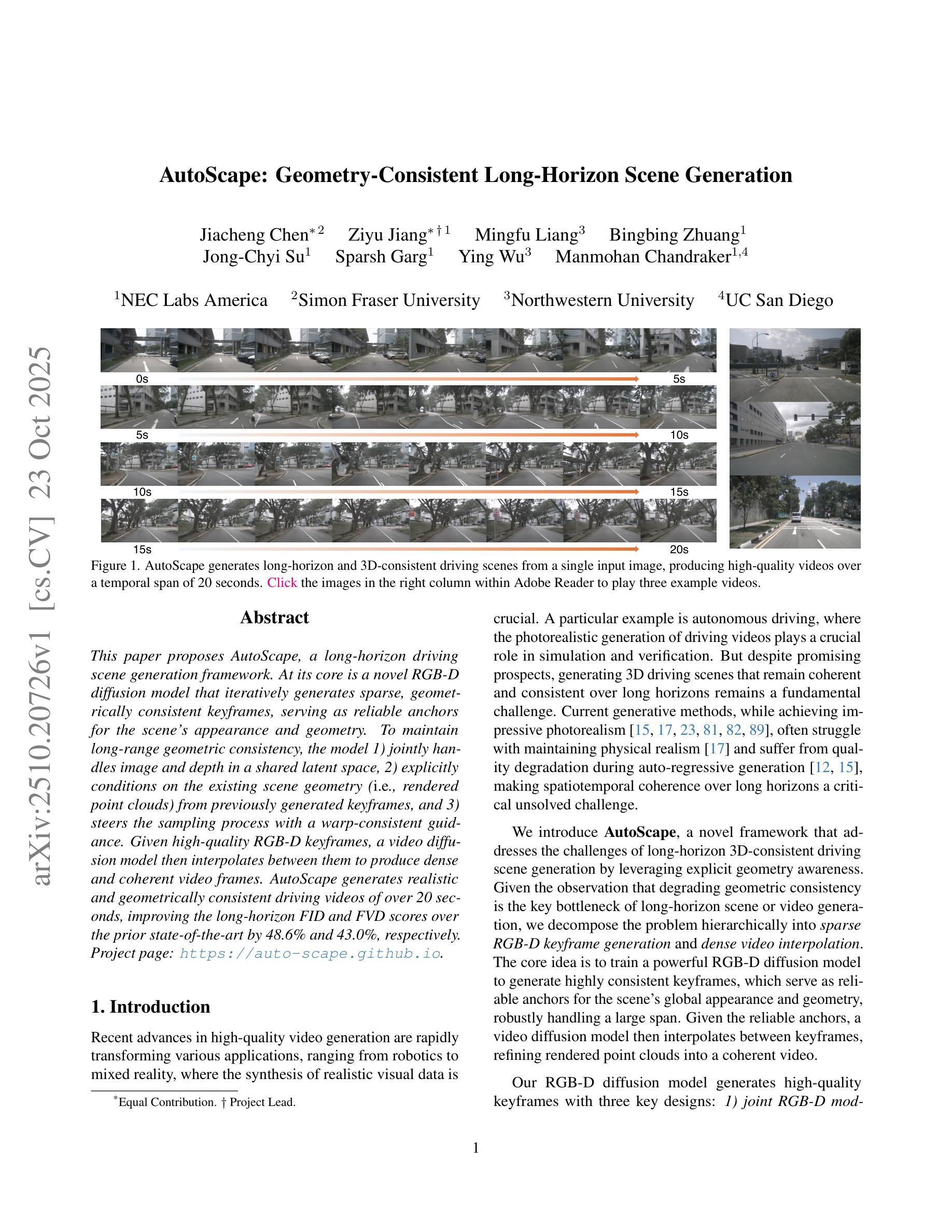 本文提出了AutoScape框架,一个用于长远视距驾驶场景生成的框架。其核心是一个新颖的RGB-D扩散模型,该模型可迭代生成稀疏且几何一致的关键帧,为场景外观和几何提供可靠锚点。通过联合处理图像和深度信息,显式条件化现有场景几何,以及用warp一致性指导采样过程来保持长距离几何一致性。给定高质量RGB-D关键帧,视频扩散模型会在它们之间进行插值,生成密集且连贯的视频帧。AutoScape可生成超过20秒的逼真且几何一致的驾驶视频,相较于现有技术,其长距离FID和FVD得分分别提高了48.6%和43.0%。