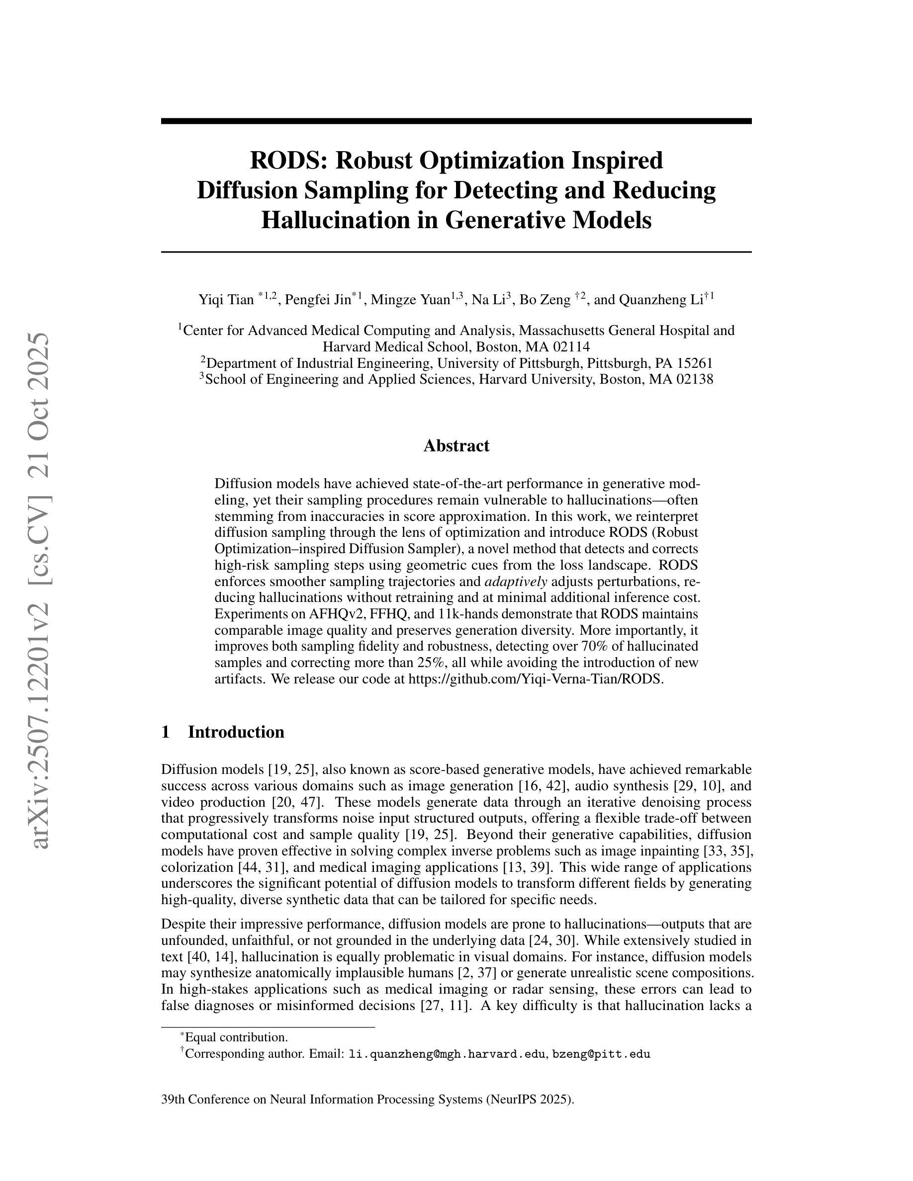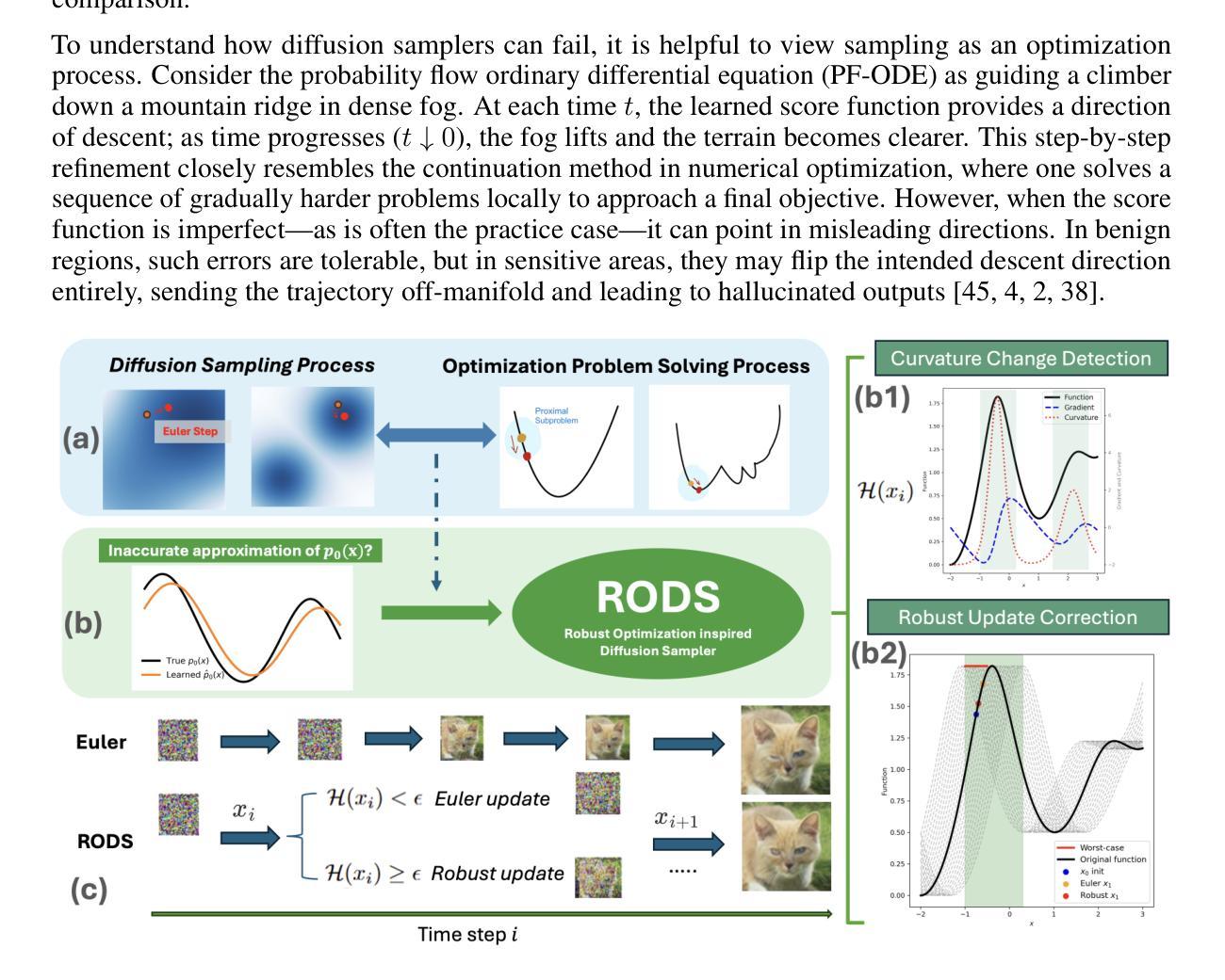 本文介绍了扩散模型在生成建模中的最新进展。尽管已达到了业界领先的性能,但其采样过程仍容易受到hallucination的影响,主要源于评分估算的不准确。本文提出一种新型采样方法——RODS(基于稳健优化的扩散采样器),该方法通过损失景观的几何线索来检测和纠正高风险的采样步骤。RODS可实现更平滑的采样轨迹,自适应调整扰动,在不进行再训练的情况下减少了hallucination,并且几乎没有增加额外的推理成本。在AFHQv2、FFHQ和11k-hands上的实验表明,RODS保持了相当的图片质量并保持了生成多样性。更重要的是,它提高了采样保真度和稳健性,能够检测出超过70%的hallucinated样本并纠正超过25%,同时避免了新产生的伪影。我们已将代码发布在[链接地址]。