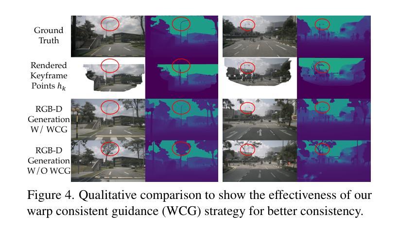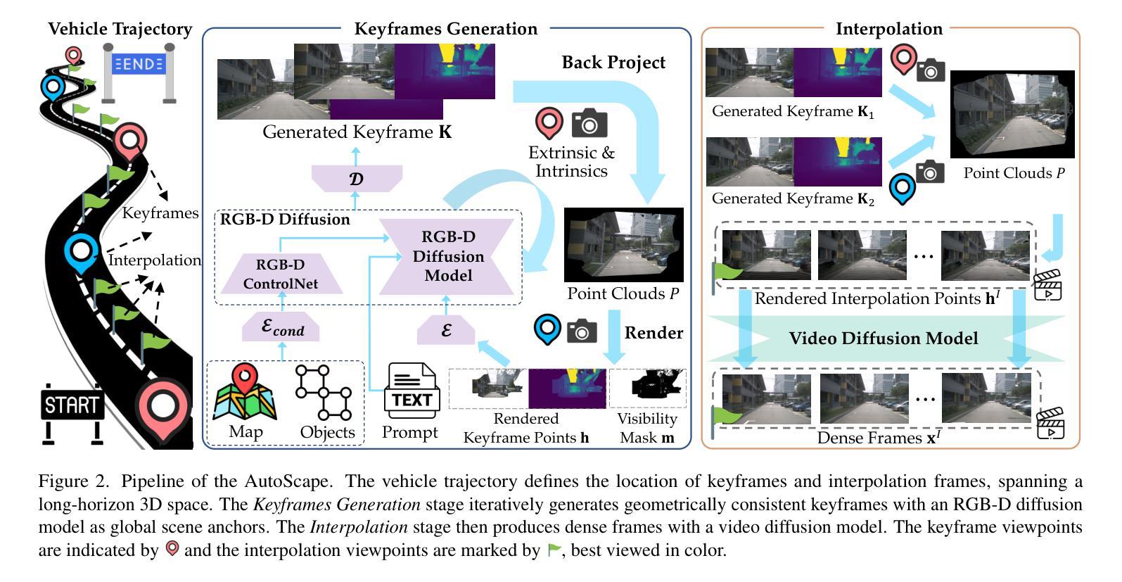 本文提出了AutoScape框架,这是一个长视野驾驶场景生成框架。其核心是一个新型的RGB-D扩散模型,该模型能够迭代生成稀疏且几何一致的关键帧,作为场景外观和几何的可靠锚点。为了保持长距离几何一致性,该模型1)在共享潜在空间中同时处理图像和深度信息;2)显式地基于先前生成的关键帧的现有场景几何(即渲染点云)进行条件处理;3)通过warp一致性指导来控制采样过程。给定高质量RGB-D关键帧后,视频扩散模型将在它们之间进行插值,以产生密集且连贯的视频帧。AutoScape能够生成超过20秒的真实和几何一致的驾驶视频,相对于先前最先进的水平,长视野FID和FVD得分分别提高了48.6%和43.0%。