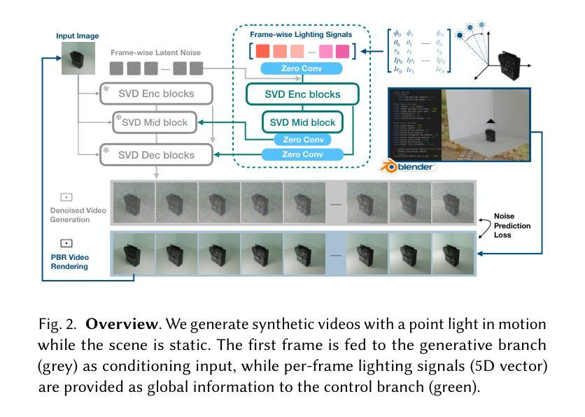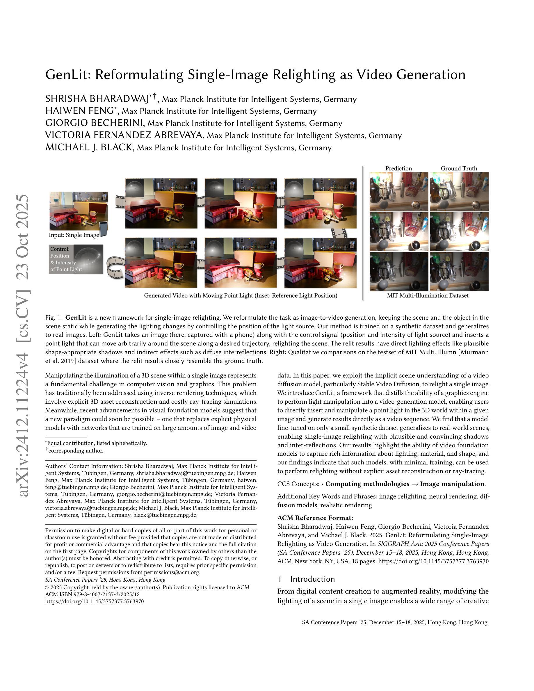 在单幅图像内操纵3D场景的照明是计算机视觉和图形学中的基本挑战。传统上,这个问题是通过逆向渲染技术来解决的,这涉及到明确的3D资产重建和昂贵的光线追踪模拟。同时,视觉基础模型的最新进展表明,一种新的范式即将到来——一个用大量图像和视频数据训练的网络来替代明确的物理模型。在本文中,我们利用视频扩散模型的隐式场景理解,特别是稳定的视频扩散,来对单幅图像进行重新照明。我们介绍了GenLit框架,它将图形引擎进行光线操作的能力提炼成视频生成模型,使用户能够在给定的图像中的3D世界里直接插入和操纵点光源,并直接生成视频序列结果。我们发现仅在小型合成数据集上进行微调后的模型可以推广到真实场景,能够实现具有可信阴影和相互反射的单图像重新照明。我们的结果突出了视频基础模型在捕捉关于照明、材料和形状丰富信息方面的能力,我们的研究结果表明,这种模型可以在极少的训练下用于执行重新照明,无需明确的资产重建或光线追踪。项目页面:https://genlit.is.tue.mpg.de/。