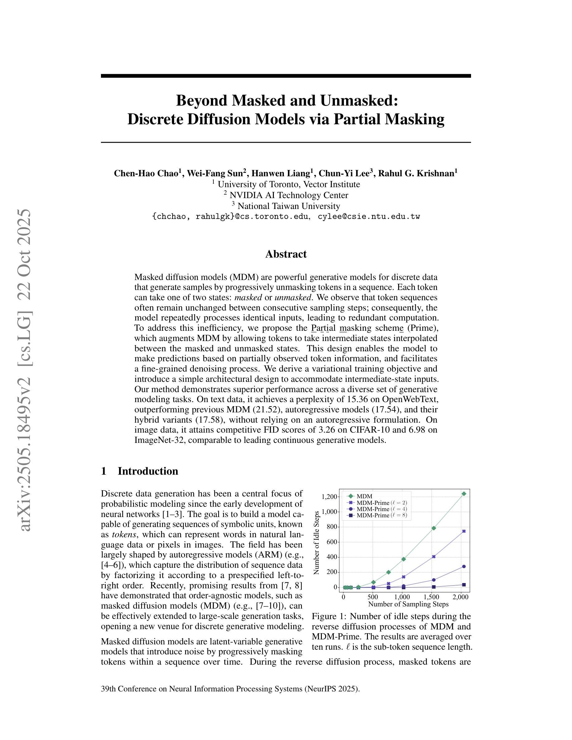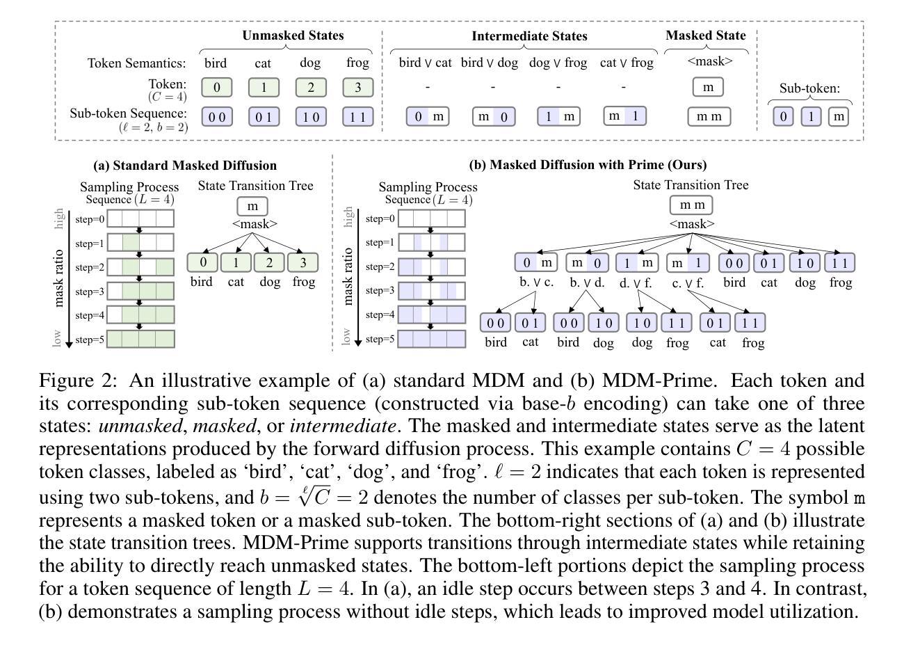 掩码扩散模型(MDM)是为离散数据设计的强大生成模型,它通过逐步揭示序列中的令牌来生成样本。每个令牌可以处于两种状态之一:掩码状态或未掩码状态。我们观察到,在连续的采样步骤之间,令牌序列往往保持不变;因此,模型会反复处理相同的输入,导致冗余计算。为了解决这种低效问题,我们提出了部分掩码方案(Prime),它通过允许令牌处于掩码状态和未掩码状态之间的中间状态,来增强MDM的功能。这种设计使模型能够基于部分观察到的令牌信息进行预测,并促进了精细的降噪过程。我们推导了变分训练目标,并引入了一种简单的架构设计来适应中间状态输入。我们的方法在多种生成建模任务上表现出卓越的性能。在文本数据上,它在OpenWebText上的困惑度达到15.36,优于先前的MDM(21.52)、自回归模型(17.54)及其混合变体(17.58),且无需依赖自回归公式。在图像数据上,它在CIFAR-10上的FID得分为3.26,在ImageNet-32上的得分为6.98,与领先的连续生成模型相当。