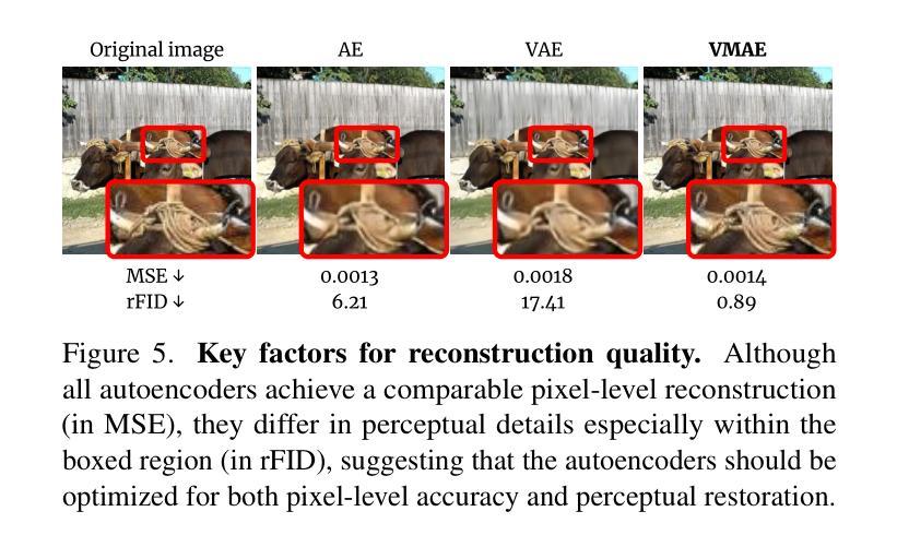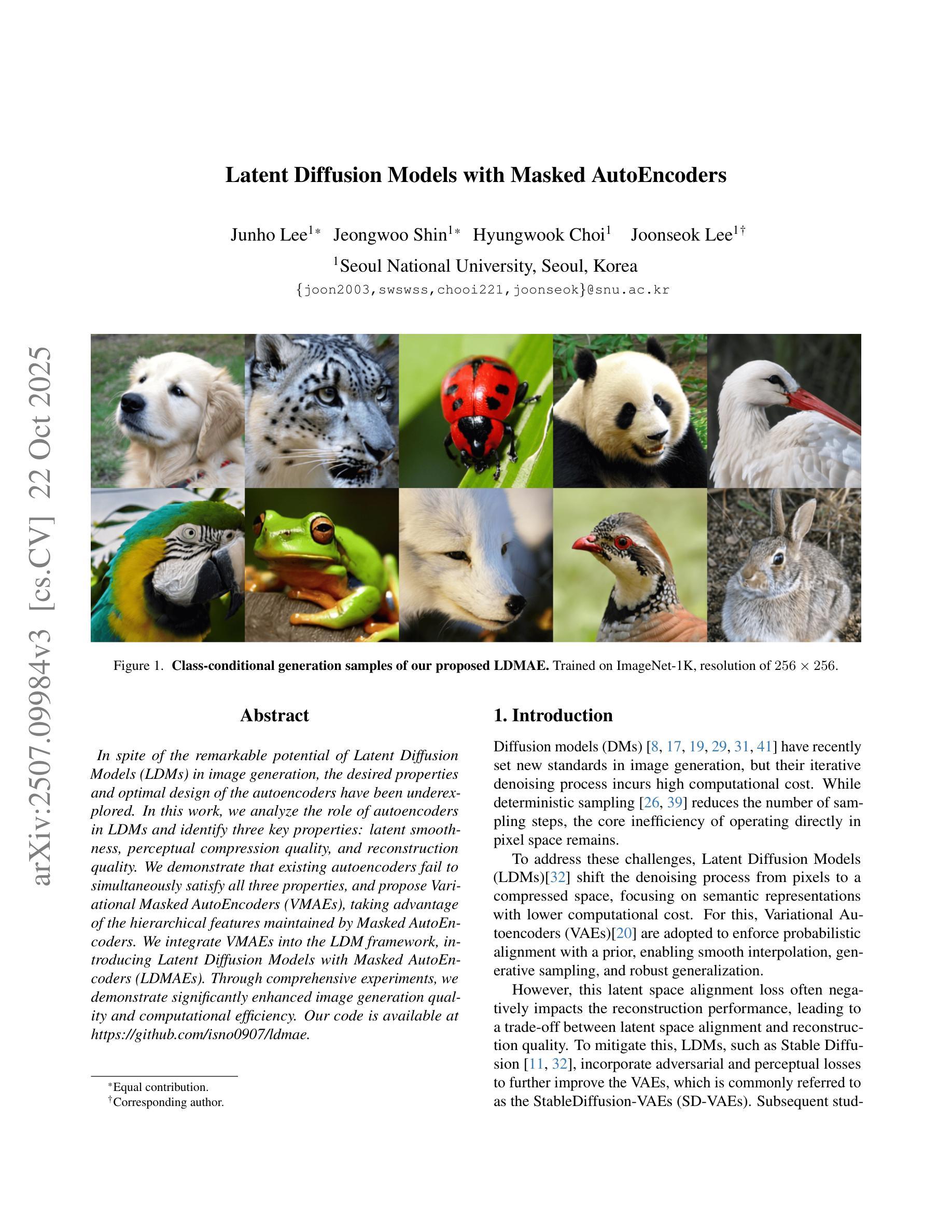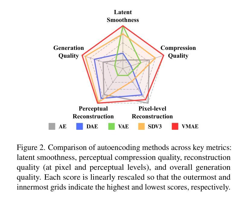 尽管潜在扩散模型(Latent Diffusion Models,简称LDM)在图像生成方面具有显著潜力,但自动编码器的理想属性和优化设计尚未得到充分探索。在这项工作中,我们分析了自动编码器在LDM中的作用,并确定了三个关键属性:潜在平滑性、感知压缩质量和重建质量。我们证明现有自动编码器无法满足这三个属性的同时,并提出利用掩码自动编码器所保留的分层特征进行变分掩码自动编码器(Variational Masked AutoEncoders,简称VMAEs)。我们将VMAEs集成到LDM框架中,引入带有掩码自动编码器的潜在扩散模型(Latent Diffusion Models with Masked AutoEncoders,简称LDMAEs)。我们的代码可在https://github.com/isno0907/ldmae找到。