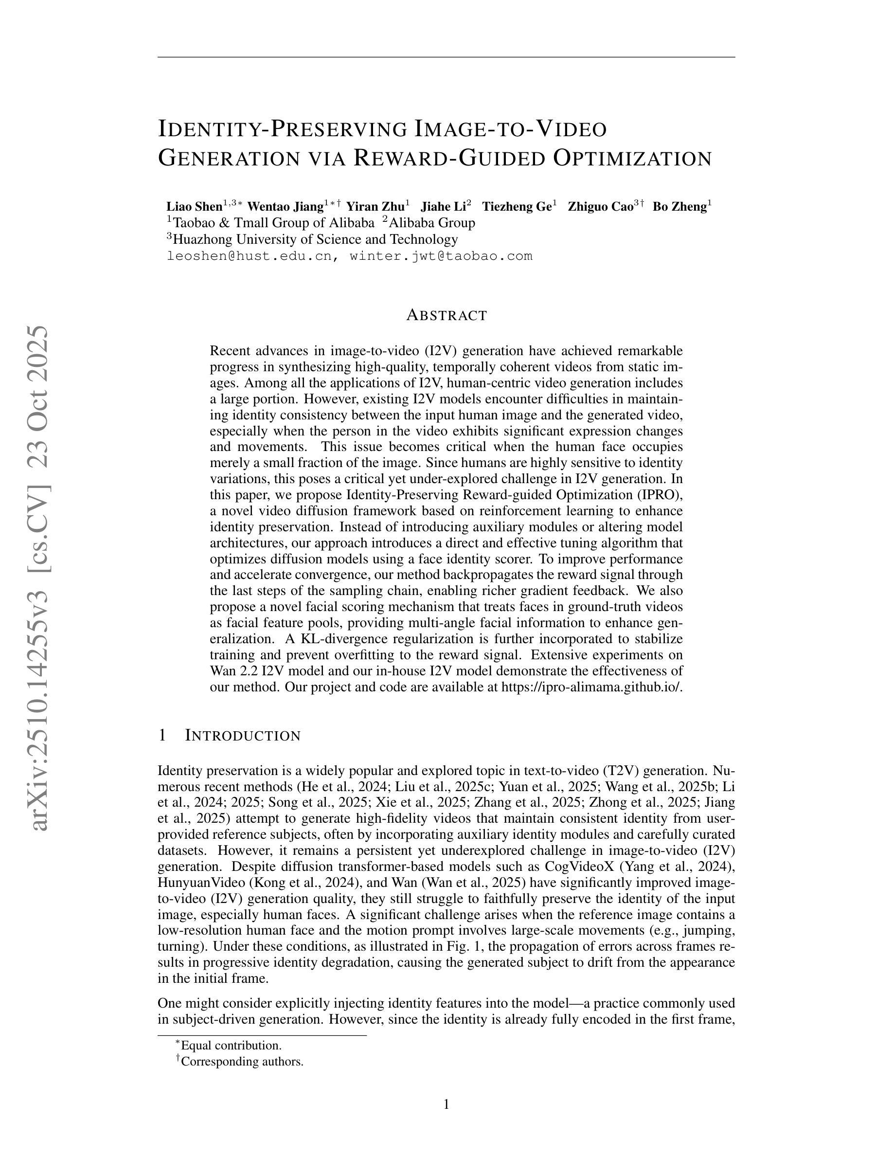 在图像到视频(I2V)生成方面的最新进展,已经在从静态图像合成高质量、时间连贯的视频方面取得了显著进展。在所有I2V应用中,以人类为中心的视频生成占据很大一部分。然而,现有的I2V模型在保持输入人像与生成视频之间身份一致性方面遇到困难,尤其是在视频中人物表情变化和动作显著时。当人脸只占图像一小部分时,这个问题变得更为关键。由于人类对身份变化高度敏感,这为I2V生成提出了一个至关重要但尚未被充分研究的挑战。在本文中,我们提出了基于强化学习的身份保留奖励引导优化(IPRO)新型视频扩散框架,以提高身份保留能力。我们的方法不是引入辅助模块或改变模型架构,而是引入了一种直接有效的调整算法,该算法使用面部身份评分者对扩散模型进行优化。为了提高性能和加速收敛,我们的方法通过采样链的最后几步反向传播奖励信号,从而实现更丰富的梯度反馈。我们还提出了一种新型的面部评分机制,将真实视频中的面部视为面部特征池,提供多角度的面部信息以增强泛化能力。还进一步融入了KL散度正则化,以稳定训练并防止对奖励信号的过度拟合。在Wan 2.2 I2V模型和我们的内部I2V模型上的大量实验证明了我们的方法的有效性。我们的项目和代码可在https://ipro-alimama.github.io/找到。