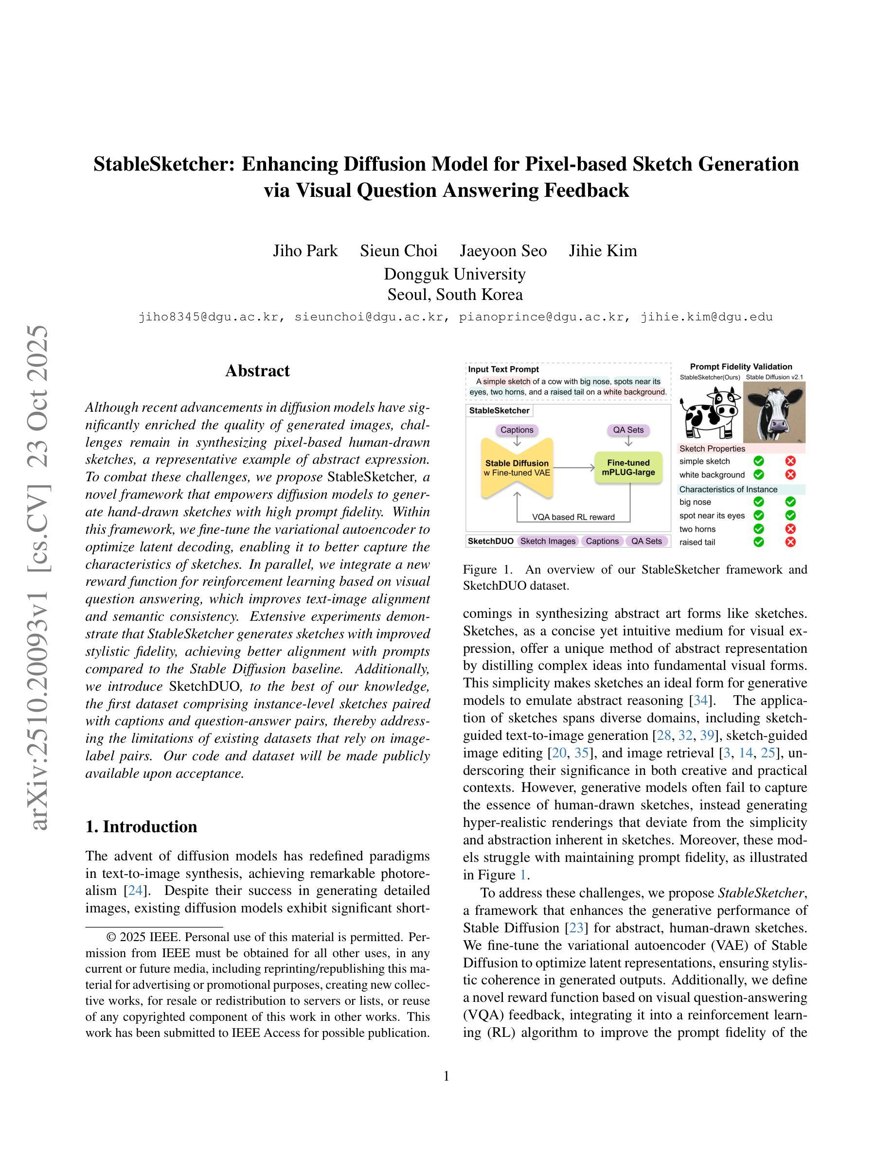 尽管扩散模型最近的进展极大地提高了生成图像的质量,但在合成基于像素的手绘草图等抽象表达代表性示例方面仍存在挑战。为了应对这些挑战,我们提出了StableSketcher,这是一个新型框架,能够赋能扩散模型生成具有高提示保真度的手绘草图。在此框架内,我们微调了变分自编码器以优化潜在解码,使其能够更好地捕捉草图的特点。同时,我们结合了一种基于视觉问答的新型奖励函数,用于强化学习,以提高文本-图像对齐和语义一致性。大量实验表明,StableSketcher生成的草图在风格保真度上有所提高,与提示的对齐程度优于Stable Diffusion基线。此外,我们还推出了SketchDUO数据集,据我们所知,它是第一个包含实例级草图与标题和问答对配对的数据集,从而解决了现有数据集仅依赖图像标签对的局限性。我们的代码和数据集将在接受后公开提供。