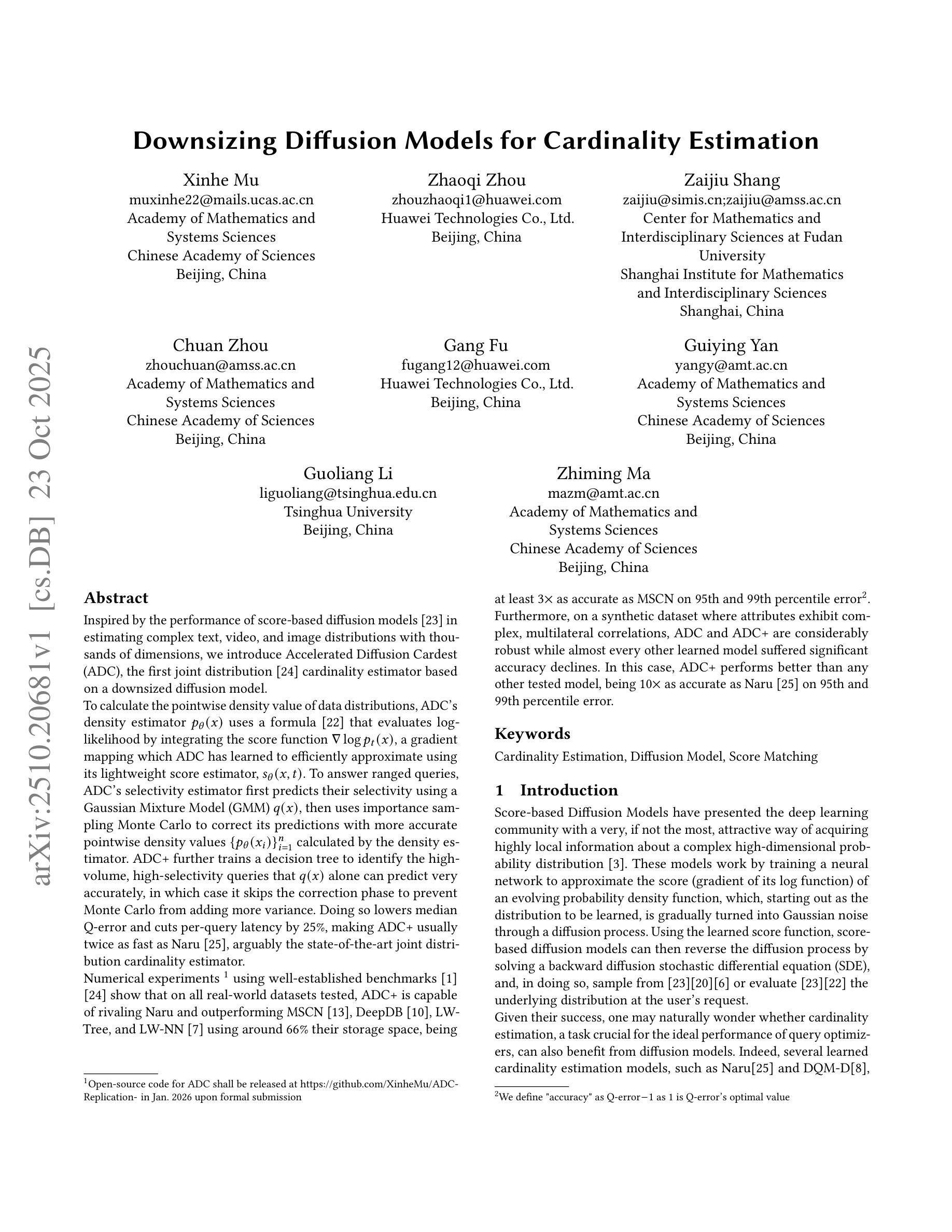 Inspired by the performance of score-based diffusion models in estimating complex text, video, and image distributions with thousands of dimensions, we introduce Accelerated Diffusion Cardest (ADC), the first joint distribution cardinality estimator based on a downsized diffusion model. To calculate the pointwise density value of data distributions, ADC’s density estimator uses a formula that evaluates log-likelihood by integrating the score function, a gradient mapping which ADC has learned to efficiently approximate using its lightweight score estimator. To answer ranged queries, ADC’s selectivity estimator first predicts their selectivity using a Gaussian Mixture Model (GMM), then uses importance sampling Monte Carlo to correct its predictions with more accurate pointwise density values calculated by the density estimator. ADC+ further trains a decision tree to identify the high-volume, high-selectivity queries that the GMM alone can predict very accurately, in which case it skips the correction phase to prevent Monte Carlo from adding more variance. Doing so lowers median Q-error and cuts per-query latency by 25 percent, making ADC+ usually twice as fast as Naru, arguably the state-of-the-art joint distribution cardinality estimator. Numerical experiments using well-established benchmarks show that on all real-world datasets tested, ADC+ is capable of rivaling Naru and outperforming MSCN, DeepDB, LW-Tree, and LW-NN using around 66 percent their storage space, being at least 3 times as accurate as MSCN on 95th and 99th percentile error. Furthermore, on a synthetic dataset where attributes exhibit complex, multilateral correlations, ADC and ADC+ are considerably robust while almost every other learned model suffered significant accuracy declines. In this case, ADC+ performs better than any other tested model, being 10 times as accurate as Naru on 95th and 99th percentile error.