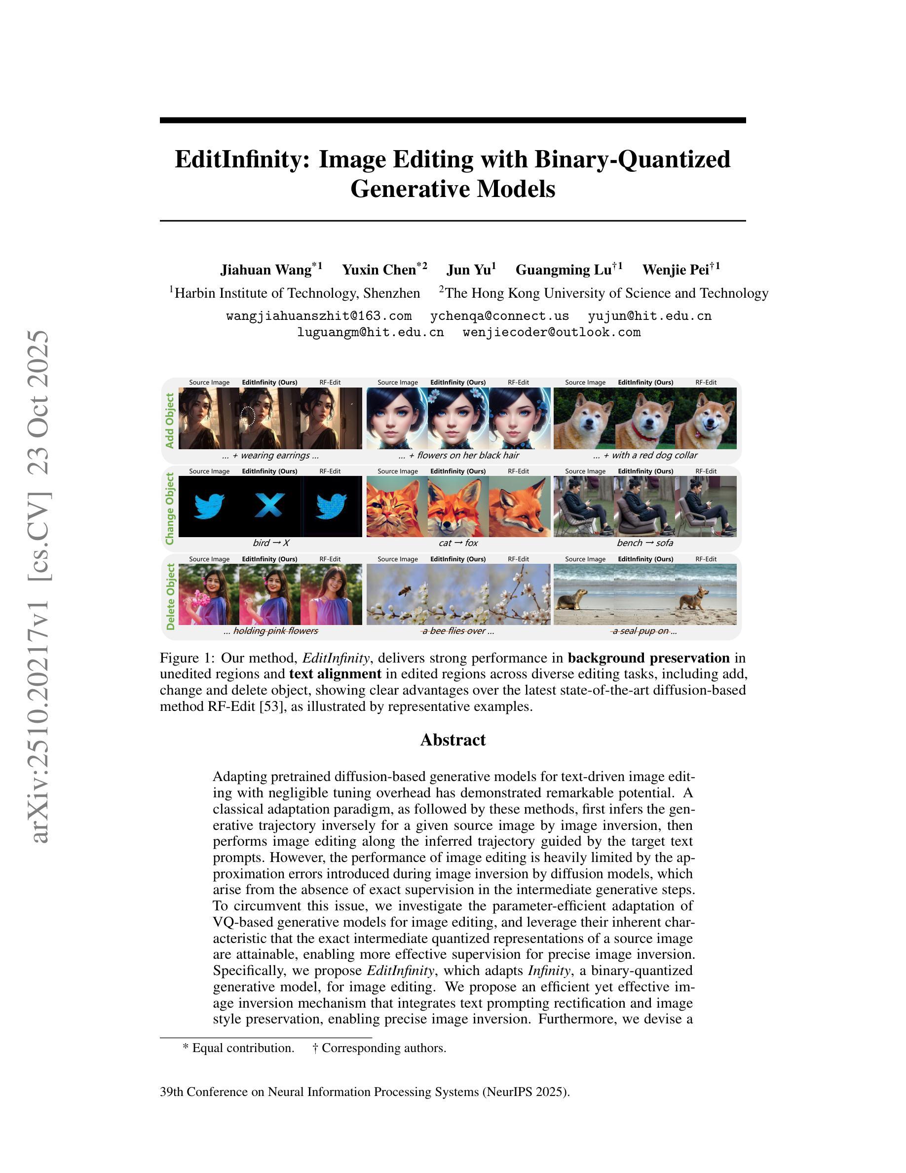 基于预训练的扩散生成模型进行文本驱动图像编辑,无需大量调整,展现出显著潜力。当前方法通过逆向推断给定源图像的生成轨迹,然后沿推断轨迹进行图像编辑,同时受目标文本提示引导。然而,由于扩散模型在图像反转过程中的近似误差,限制了图像编辑的效果。这些误差源于中间生成步骤中缺乏精确监督。为了解决这个问题,我们研究了VQ基生成模型的参数高效适应图像编辑方法,利用其固有的特性——获取源图像的中间量化表示,为精确图像反转提供更有效的监督。我们提出了EditInfinity,它适应了Infinity这一二元量化生成模型用于图像编辑。我们设计了一个高效而精确的图像反转机制,融合了文本提示校正和图像风格保持,使图像反转更加精确。此外,我们还提出了整体平滑策略,使EditInfinity能够在保持源图像高保真度的同时进行精确的语义文本对齐编辑。在PIE-Bench基准测试上的实验表明,我们的模型在添加、更改和删除编辑操作上的性能均优于最先进的扩散基准模型。
