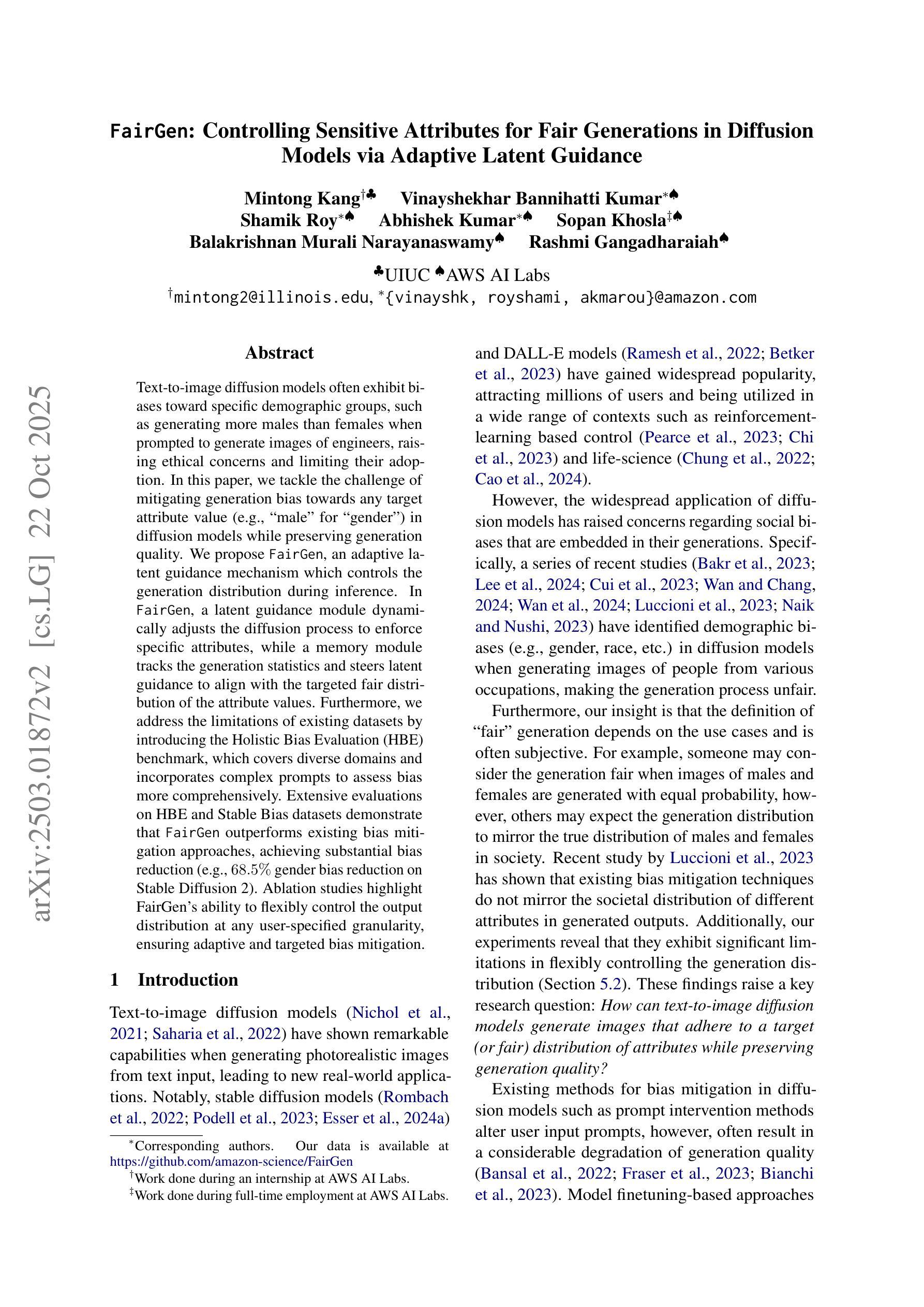 文本到图像的扩散模型往往会对特定的群体产生偏见,例如在提示生成工程师图像时,生成更多的男性而不是女性,这引发了伦理担忧,并限制了其采用。在本文中,我们解决了在扩散模型中缓解对任何目标属性值的生成偏见(例如,“性别”中的“男性”)的挑战,同时保持生成质量。我们提出了FairGen,这是一种自适应的潜在指导机制,用于控制推理过程中的生成分布。在FairGen中,潜在指导模块动态调整扩散过程以强制执行特定属性,而记忆模块则跟踪生成统计信息,并引导潜在指导与属性值的公平分布目标保持一致。此外,我们通过引入全面的偏见评估(HBE)基准,解决了现有数据集的限制,该基准涵盖多个领域并包含复杂的提示,以更全面地评估偏见。在HBE和Stable Bias数据集上的广泛评估表明,FairGen优于现有的偏见缓解方法,实现了显著的偏见减少(例如在Stable Diffusion 2上实现了68.5%的性别偏见减少)。消融研究突出了FairGen在用户指定的任何粒度上灵活控制输出分布的能力,确保自适应和有针对性的偏见缓解。