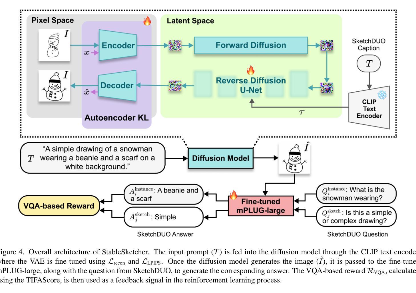 本文提出一种名为StableSketcher的新型框架,用于增强扩散模型生成手绘素描图的能力。该框架通过微调变分自编码器以优化潜在解码,并引入基于视觉问答的强化学习奖励函数,提高了文本与图像的对齐和语义一致性。实验表明,StableSketcher生成的素描图在风格保真度上有所提高,与提示对齐的效果更好。此外,还推出了SketchDUO数据集,包含带注释的实例级素描图,解决了现有数据集依赖图像标签对的局限性。