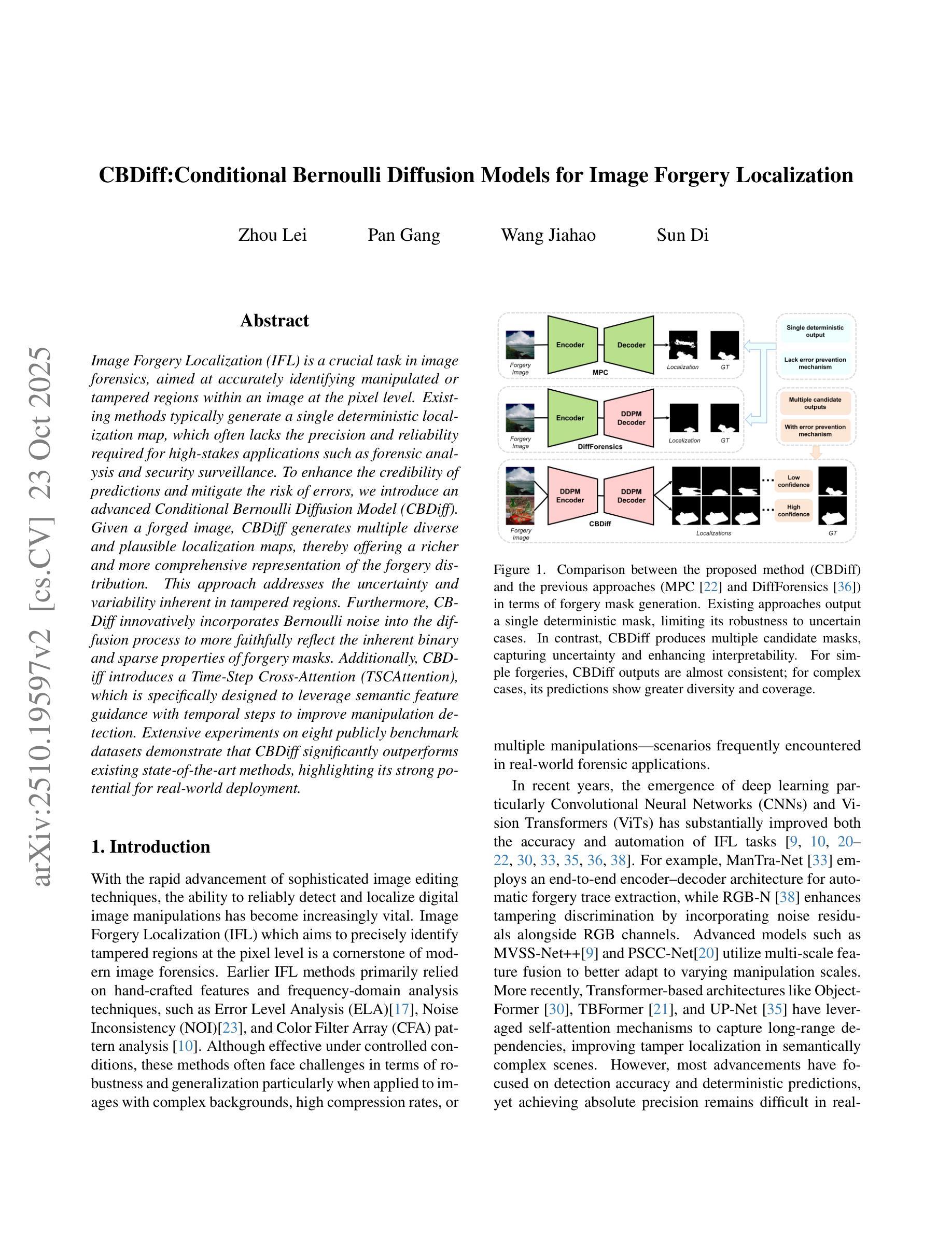 本文介绍了图像伪造定位(IFL)任务的重要性及其在图像取证领域的应用。现有方法通常生成单个确定性定位图,缺乏在高级应用(如取证分析和安全监控)中所需的高精度和可靠性。为改进预测的可信度并降低错误风险,本文引入了先进的条件伯努利扩散模型(CBDiff)。给定伪造图像,CBDiff能够生成多个多样化和合理的定位图,从而提供更丰富和全面的伪造分布表示。此方法解决了篡改区域中固有的不确定性和变化性。此外,CBDiff还将伯努利噪声融入扩散过程,更真实地反映了伪造掩膜的固有二进制和稀疏属性。同时,CBDiff引入了时间步交叉注意力(TSCAttention)机制,专门设计用于利用语义特征指导与临时步骤来提高操作检测。在八个公开基准数据集上的广泛实验表明,CBDiff显著优于现有最先进的方法,突显其在现实世界部署的强大潜力。