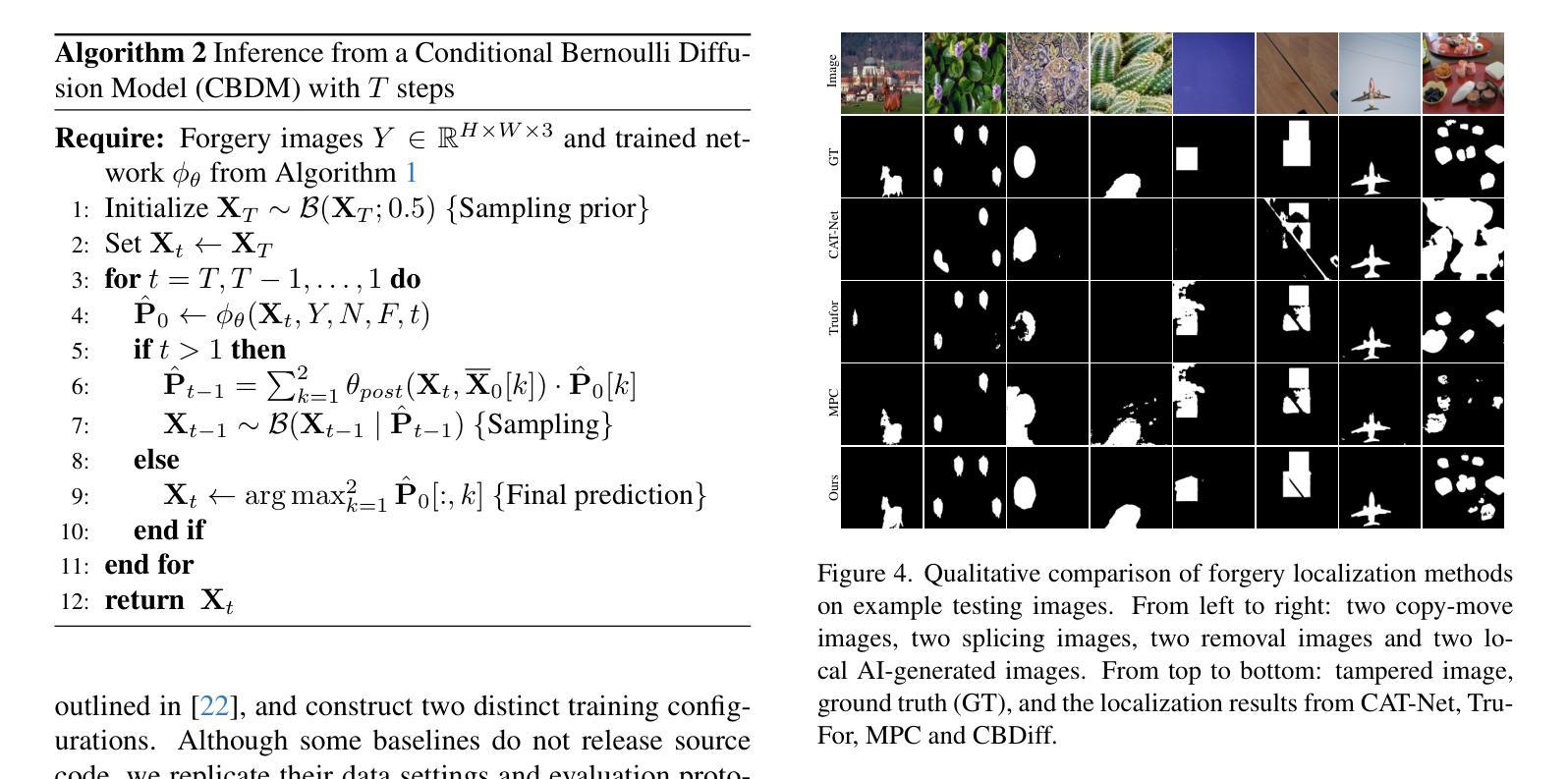 图像伪造定位(IFL)是图像取证中的一项关键任务,旨在准确地在像素级别识别图像中被操纵或篡改的区域。现有方法通常生成单个确定性定位图,这通常缺乏用于高风险应用(例如法医分析和安全监控)所需的高精度和可靠性。为了提高预测的可靠性并降低错误风险,我们引入了一种先进的条件伯努利扩散模型(CBDiff)。给定伪造图像,CBDiff生成多个多样化和合理的定位图,从而为伪造分布提供更丰富和全面的表示。此方法解决了篡改区域固有的不确定性和变化性。此外,CBDiff创新地将伯努利噪声融入扩散过程,以更真实地反映伪造掩码的固有二进制和稀疏属性。此外,CBDiff还引入了时间步交叉注意力(TSCAttention),专门设计用于利用语义特征指导与时间步的结合来提高操纵检测的性能。在八个公开基准数据集上的大量实验表明,CBDiff显著优于现有的最先进方法,突显其在现实世界部署的强大潜力。