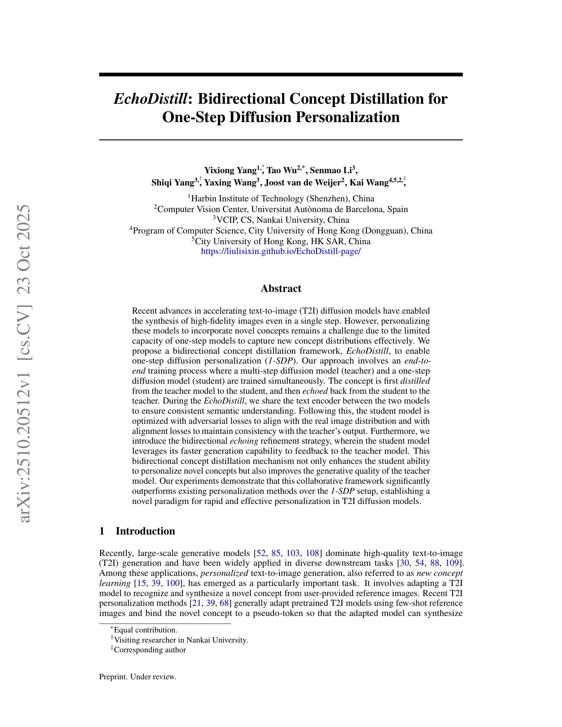 近期加速文本到图像(T2I)扩散模型的进展使得一步合成高清图像成为可能。然而,由于一步模型在有效捕捉新概念分布方面的能力有限,将这些模型个性化以融入新观念仍然是一个挑战。我们提出了一种双向概念蒸馏框架EchoDistill,以实现一步扩散个性化(1-SDP)。我们的方法涉及端到端的训练过程,其中多步扩散模型(教师)和一步扩散模型(学生)同时进行训练。概念首先从教师模型蒸馏到学生模型,然后从学生模型反馈回教师模型。在EchoDistill过程中,我们在两个模型之间共享文本编码器,以确保一致的语义理解。之后,学生模型通过对抗损失进行优化,以与真实图像分布对齐,并通过对齐损失来保持与教师模型输出的一致性。此外,我们引入了双向回声细化策略,学生模型利用其更快的生成能力来反馈给教师模型。这种双向概念蒸馏机制不仅提高了学生模型对新颖概念的个性化能力,而且提高了教师模型的生成质量。我们的实验表明,这一协作框架在1-SDP设置上显著优于现有个性化方法,为文本到图像扩散模型中的快速有效个性化建立了新范式。