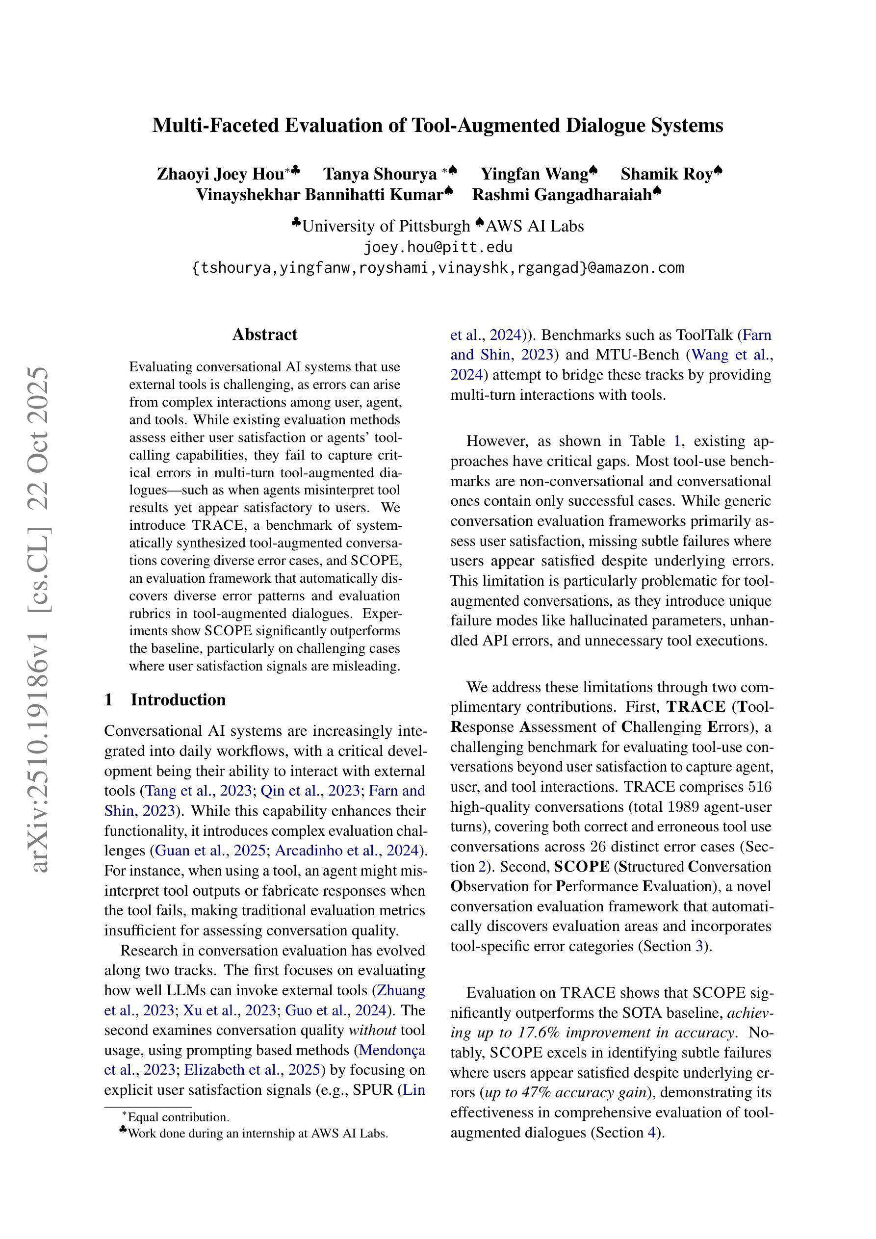 - 介绍SCOPE评估框架,能够自动发现工具辅助对话中的错误模式并进行评估。