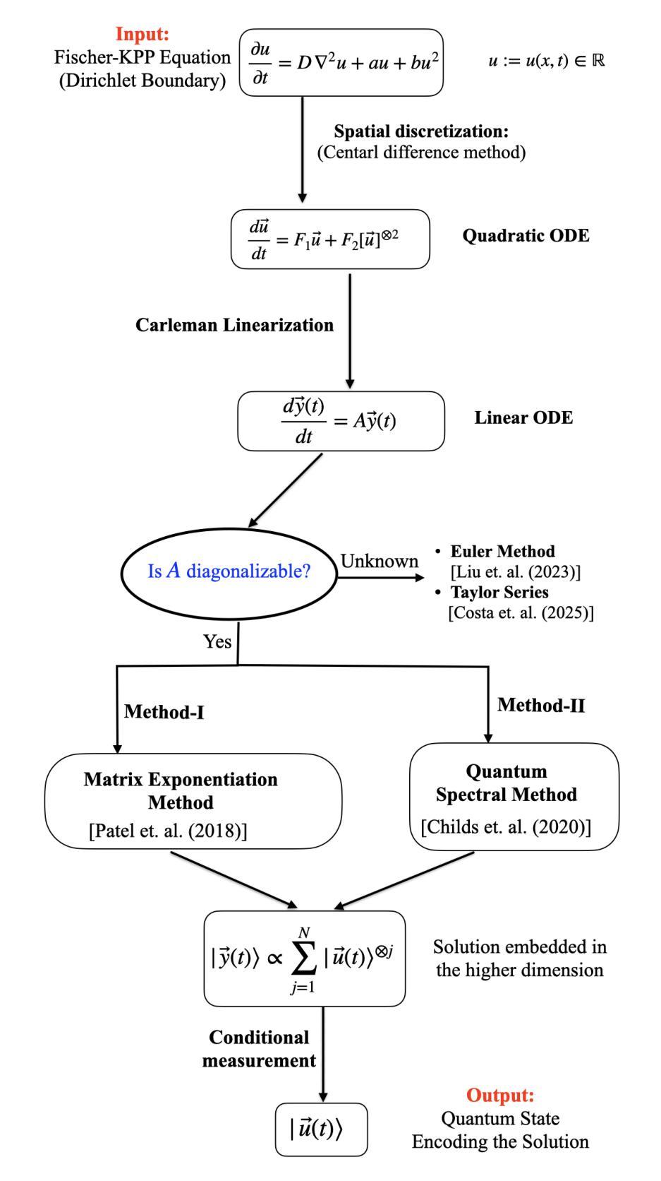 我们提出了两个用于解决反应扩散方程的新量子算法,这两个算法采用截断切比雪夫多项式逼近法。该方法用于数值求解由相关非线性微分方程线性化产生的常微分方程。在第一个算法中,我们使用了矩阵指数法(Patel等人,2018年),而在第二个算法中,我们重新利用了量子谱方法(Childs等人,2020年)。我们的主要技术贡献是推导出卡尔曼嵌入矩阵对角化的充分条件,这对于设计两种量子算法都是不可或缺的。为此,我们还提供了一种有效的迭代算法来对卡尔曼矩阵进行对角化。我们的第一个算法的门复杂度为O(d·log(d)+T·polylog(T/ε))。其中d是卡尔曼矩阵的大小,T是模拟时间,ε是近似误差。第二个算法在log(d)、T和log(1/ε)上是多项式的——门复杂度为O(polylog(d)·T·polylog(T/ε))。就T和ε而言,这与当前解决此问题的最佳已知量子算法——截断泰勒级数法(Costa等,2025年)所获得的加速效果相当。我们的方法有两个缺点。首先,我们没有提供卡尔曼矩阵条件数的d的上界。其次,对角化的成功是基于一个猜想,即特定的三角方程没有整数解。然而,我们提供了策略,在大多数实际情况下可以缓解这些缺点。