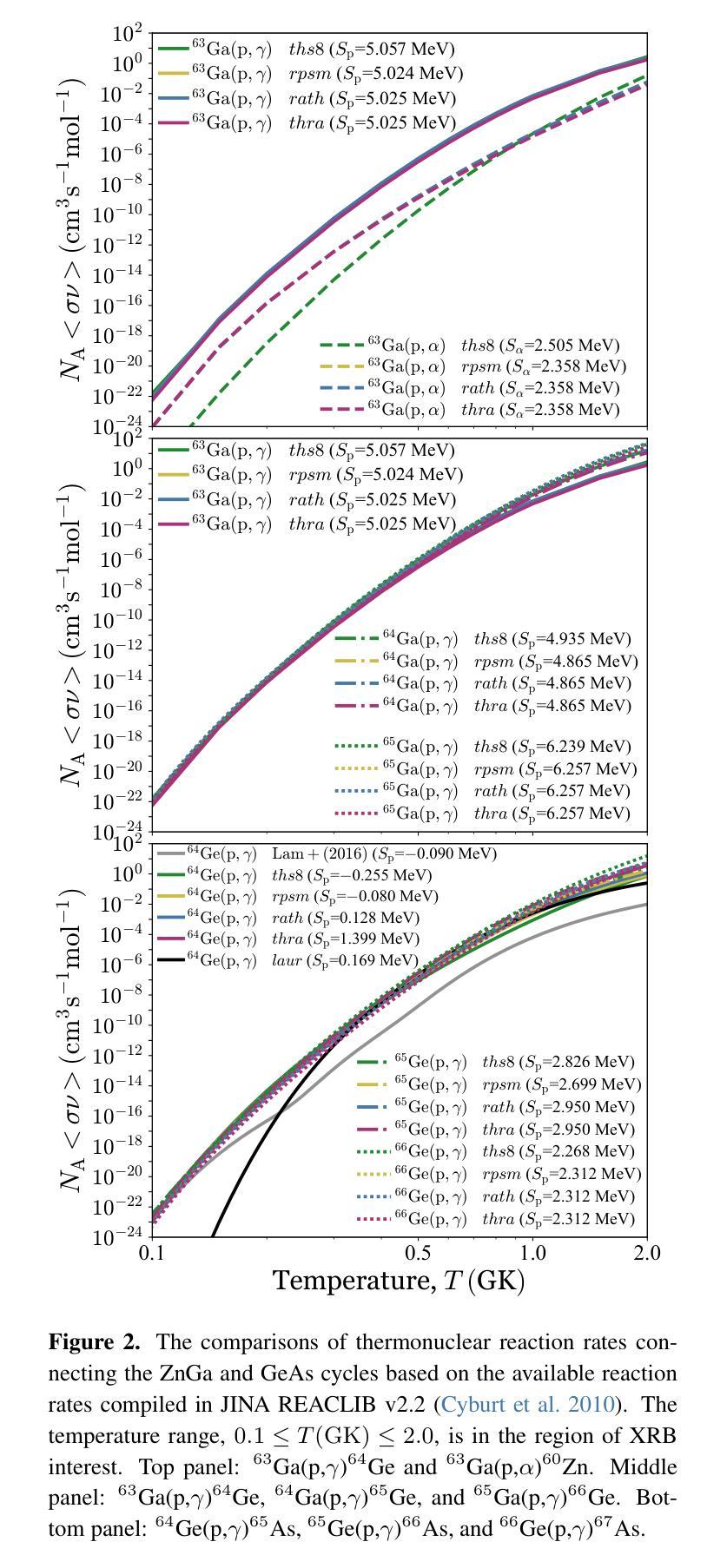 - 第$^{63}$Ga(p,$\gamma$)$^{64}$Ge和$^{64}$Ge(p,$\gamma$)$^{65}$As核反应连接了ZnGa和GeAs循环,调整了快速质子捕获过程的流向。