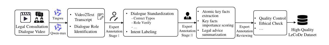 Legal consultation is essential for safeguarding individual rights and ensuring access to justice, yet remains costly and inaccessible to many individuals due to the shortage of professionals. While recent advances in Large Language Models (LLMs) offer a promising path toward scalable, low-cost legal assistance, current systems fall short in handling the interactive and knowledge-intensive nature of real-world consultations. To address these challenges, we introduce LeCoDe, a real-world multi-turn benchmark dataset comprising 3,696 legal consultation dialogues with 110,008 dialogue turns, designed to evaluate and improve LLMs’ legal consultation capability. With LeCoDe, we innovatively collect live-streamed consultations from short-video platforms, providing authentic multi-turn legal consultation dialogues. The rigorous annotation by legal experts further enhances the dataset with professional insights and expertise. Furthermore, we propose a comprehensive evaluation framework that assesses LLMs’ consultation capabilities in terms of (1) clarification capability and (2) professional advice quality. This unified framework incorporates 12 metrics across two dimensions. Through extensive experiments on various general and domain-specific LLMs, our results reveal significant challenges in this task, with even state-of-the-art models like GPT-4 achieving only 39.8% recall for clarification and 59% overall score for advice quality, highlighting the complexity of professional consultation scenarios. Based on these findings, we further explore several strategies to enhance LLMs’ legal consultation abilities. Our benchmark contributes to advancing research in legal domain dialogue systems, particularly in simulating more real-world user-expert interactions.
