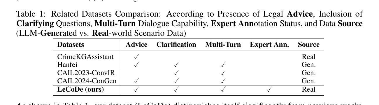 - 引入LeCoDe数据集,包含真实的法律咨询对话,旨在评估和改进LLM的法律咨询能力。
