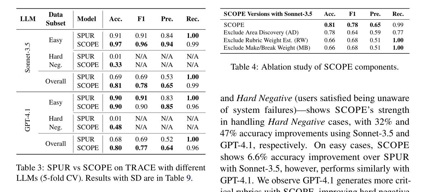 - SCOPE框架特别擅长处理挑战情况,如代理误解工具结果但对用户而言却表现满意的情况。