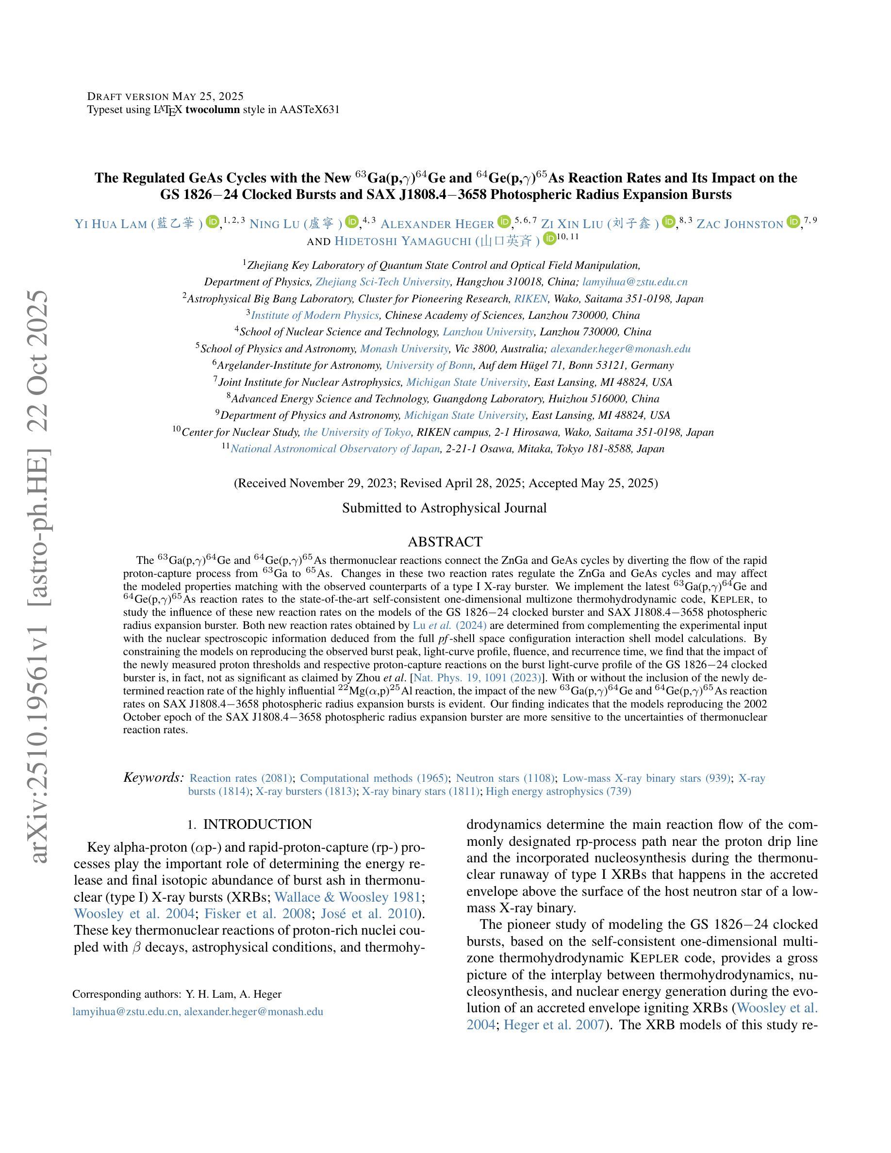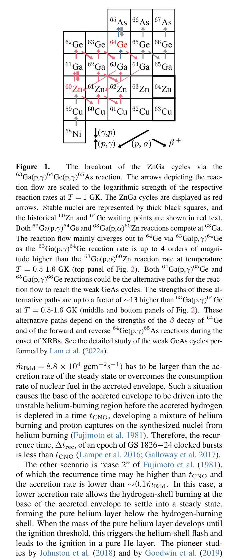 第63号Ga(p,γ)第64号Ge和第64号Ge(p,γ)第65号As的热核反应连接了ZnGa和GeAs循环,通过将从第63号Ga的快速质子捕获过程转移到第65号As。这两个反应速率的变化调节ZnGa和GeAs循环,并可能影响与I型X射线爆发者观察到的对应物的模型属性。我们采用最新的第63号Ga(p,γ)第64号Ge和第64号Ge(p,γ)第65号As反应率,将其纳入最新的一维多区热动力代码KEPLER中,以研究这些新反应率对GS 1826-24计时爆发器和SAX J1808.4-3658光球半径扩展爆发器模型的影响。这两种新的反应速率由Lu等人确定(物理评论C 110,065804(2024年))是通过补充实验输入和从完整的pf壳空间配置相互作用壳模型计算推导出的核光谱信息得出的。通过约束模型以重现观察到的爆发峰值、光变曲线轮廓、流量和复发时间,我们发现新测量的质子阈值和各自的质子捕获反应对GS 1826-24计时爆发器的爆发光变曲线轮廓的影响实际上并不像Zhou等人所声称的那样重要。[自然物理 首页上全篇幅报道第19期(2023年)。无论是否包含新确定的具有高度影响力的第22号Mg(α、质子)第25号Al的反应速率,新的第Ga(p、γ)第Ge和第Ge(p、γ)第As的反应速率对SAX J1808.4-3658光球半径扩展爆发的明显影响是明显的。我们的研究结果表明,复制SAX J1808.4-3658光球半径扩张爆发器在时隔久远后重现的模型对于热核反应速率的不确定性更为敏感。
