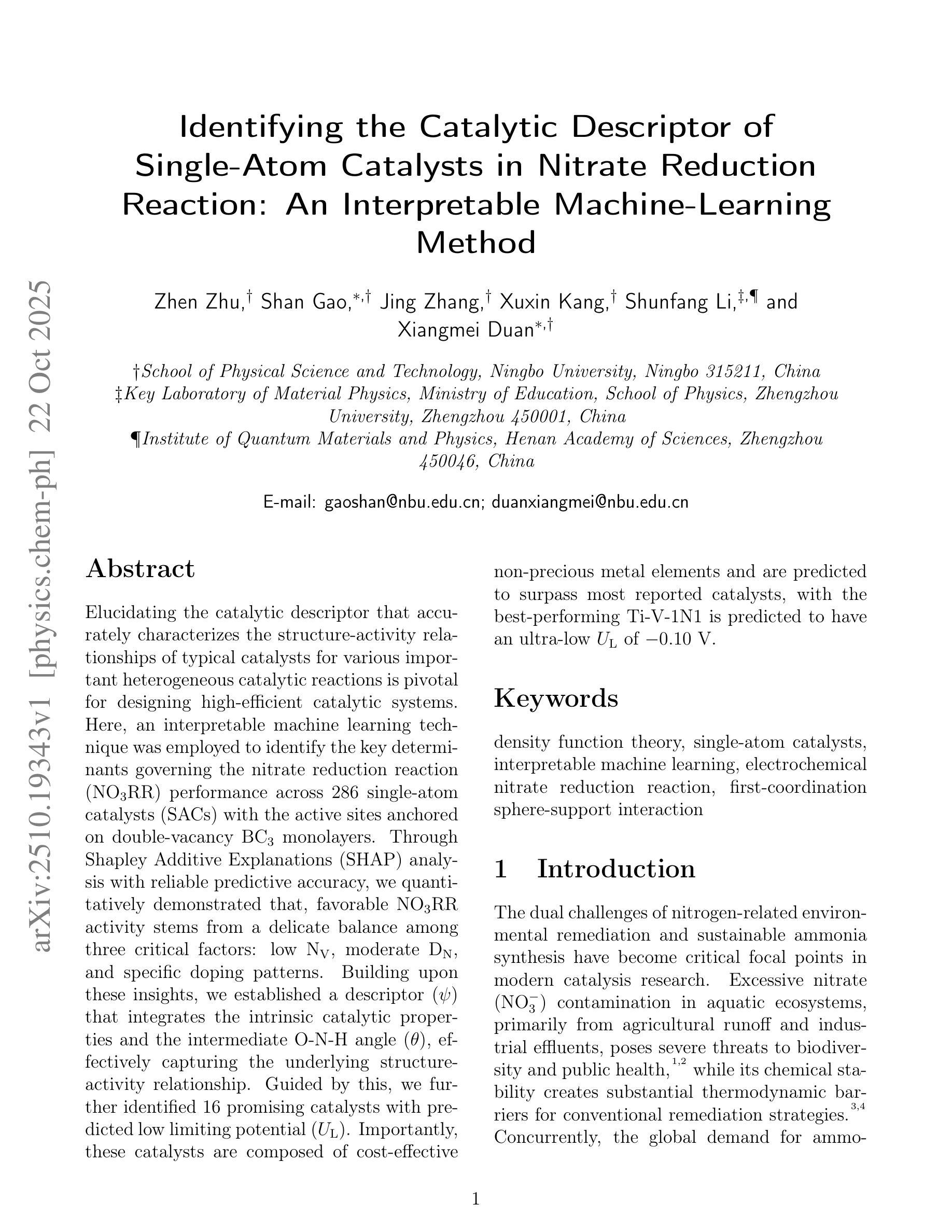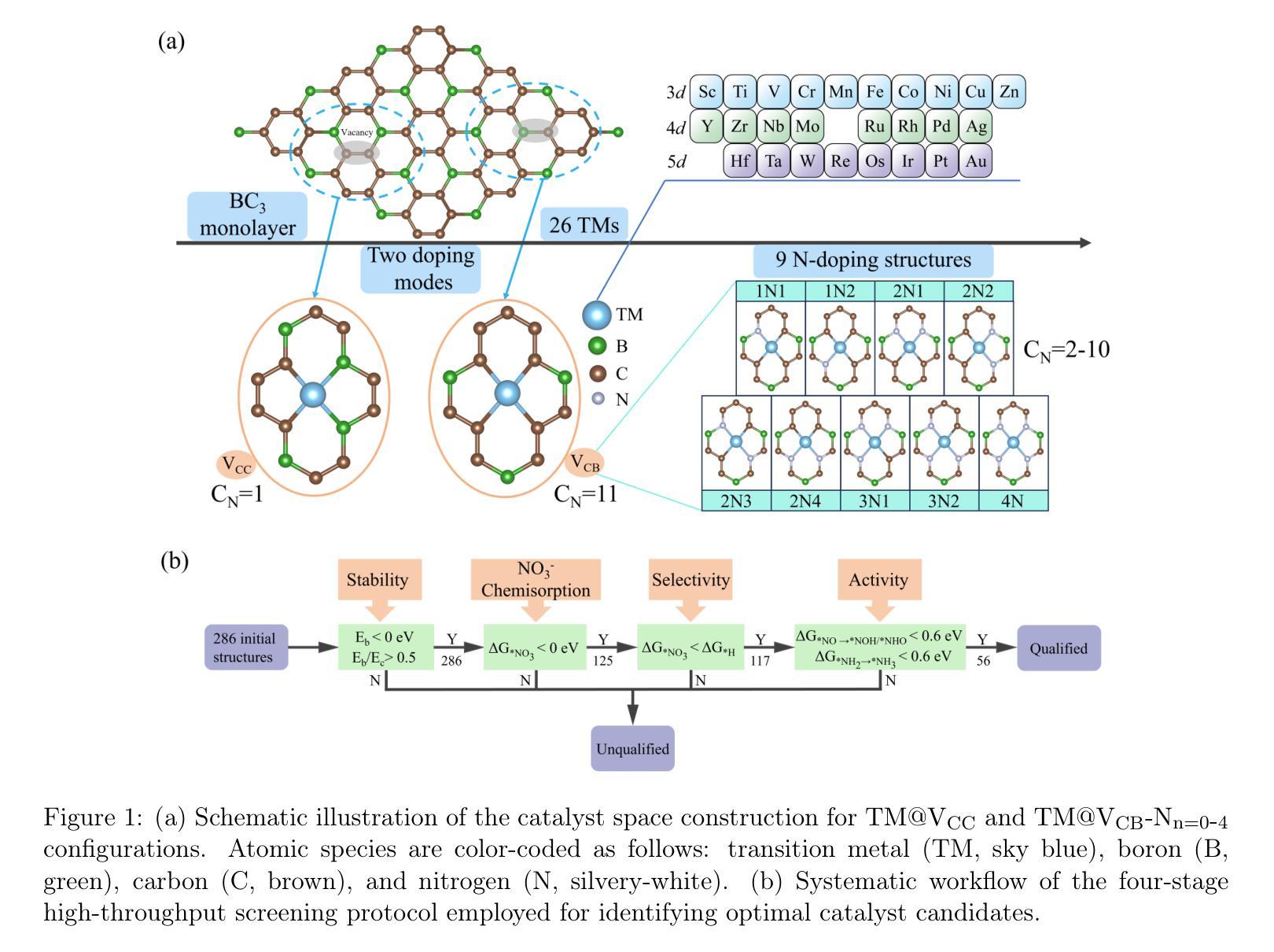 阐明能够准确描述各种重要非均相催化反应典型催化剂的结构-活性关系的催化描述符,对于设计高效催化系统至关重要。在这里,采用可解释的机器学习技术来确定控制硝酸盐还原反应(NO3RR)性能的关键因素,涉及286个单原子催化剂(SACs),其活性位点锚定在双空位BC3单层上。通过具有可靠预测精度的Shapley加法解释(SHAP)分析,我们定量证明了有利的NO3RR活性来源于三个关键因素之间的微妙平衡:低NV、中度DN和特定的掺杂模式。基于这些见解,我们建立了一个描述符(ψ),它结合了内在的催化特性和中间态O-N-H角(θ),有效地捕捉了潜在的结构-活性关系。在此基础上,我们进一步识别了16种具有预测低极限电位(UL)的有前途的催化剂。重要的是,这些催化剂由成本效益高的非贵金属元素组成,并预测将超越大多数已报道的催化剂,其中性能最佳的Ti-V-1N1预计具有超低UL为-0.10V。
