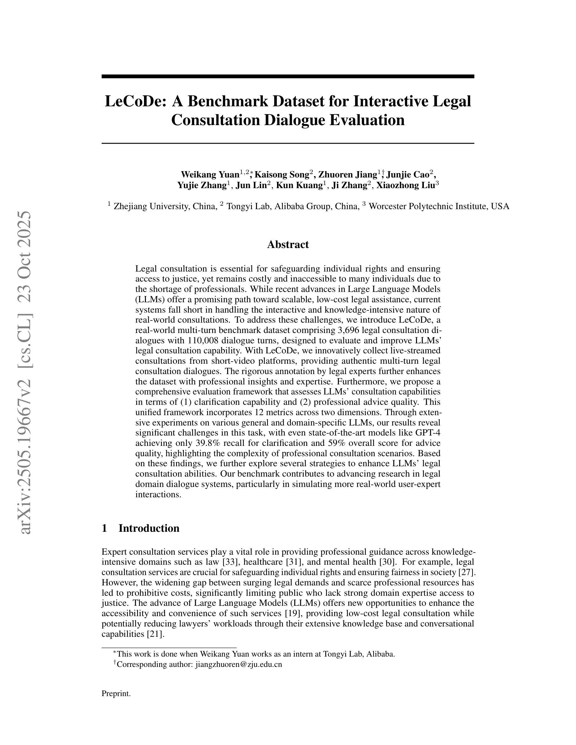法律咨询对于保护个人权利和确保获得司法公正至关重要,然而由于专业人员短缺,许多个体仍然觉得成本高昂且难以获得。尽管大型语言模型(LLM)的最新进展为可扩展且低成本的法律援助提供了前景,但当前的系统在处理真实世界中互动的、知识密集型的咨询方面仍然力不从心。为了解决这些挑战,我们推出了LeCoDe,这是一个现实世界的多轮基准数据集,包含3696个法律咨询对话和110008个对话轮次,旨在评估和改进LLM的法律咨询能力。通过LeCoDe,我们创新地从短视频平台收集直播咨询,提供真实的多轮法律咨询对话。法律专家的严格注释进一步增强了数据集的专业见解和专业知识。此外,我们提出了一个全面的评估框架,该框架从(1)澄清能力和(2)专业建议质量两个方面评估LLM的咨询能力。这一统一框架涵盖了两个维度的12个指标。通过对各种通用和特定领域的LLM进行的广泛实验,我们的结果揭示了此任务面临巨大挑战,即使是像GPT-4这样最先进模型在澄清方面的召回率也只有39.8%,建议质量的总体得分也只有59%,这凸显了专业咨询场景的复杂性。基于这些发现,我们进一步探索了几种增强LLM法律咨询能力的策略。我们的基准测试有助于推进法律领域对话系统的研究,特别是在模拟更现实的用户与专家互动方面。