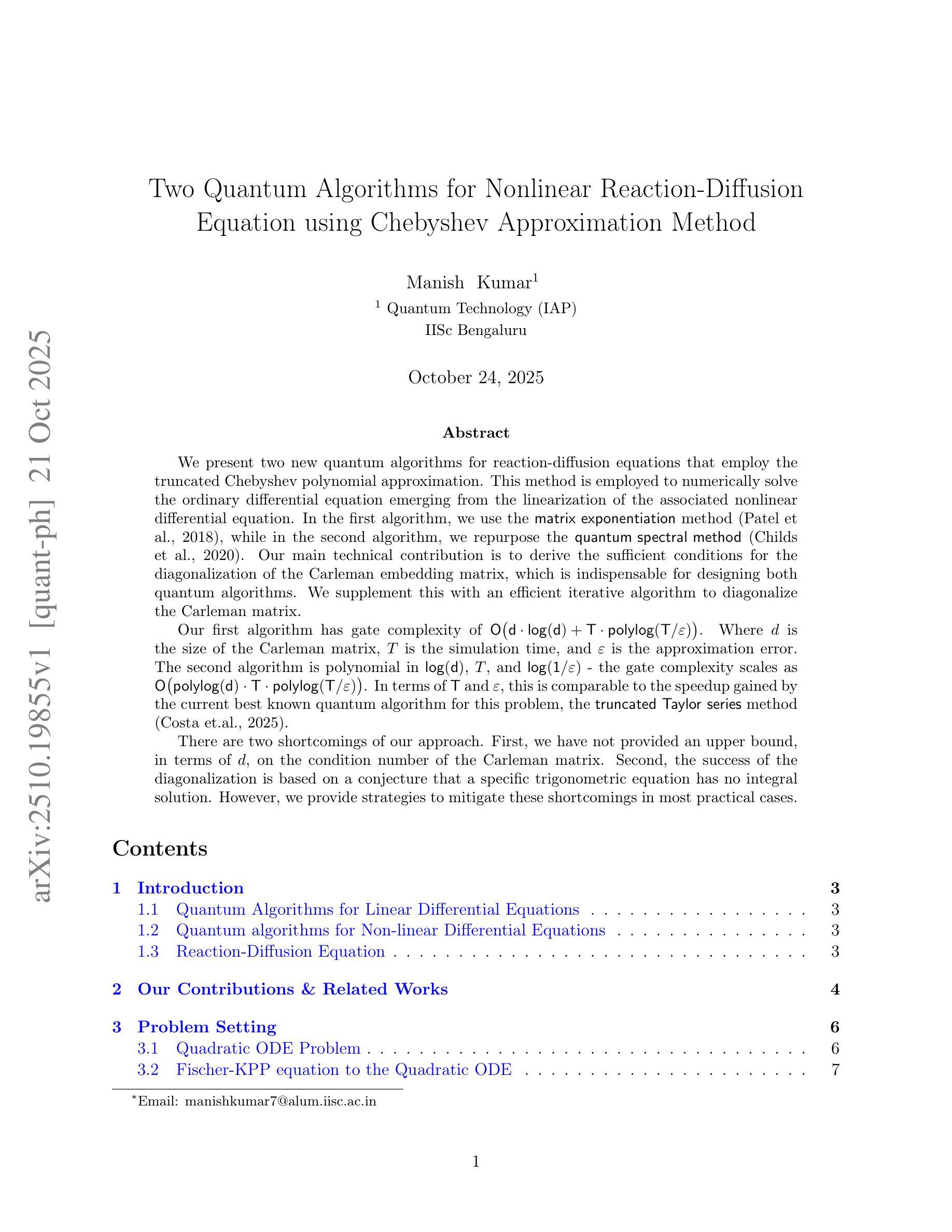 - 提出两种新量子算法,使用截断切比雪夫多项式逼近法解决反应扩散方程。
