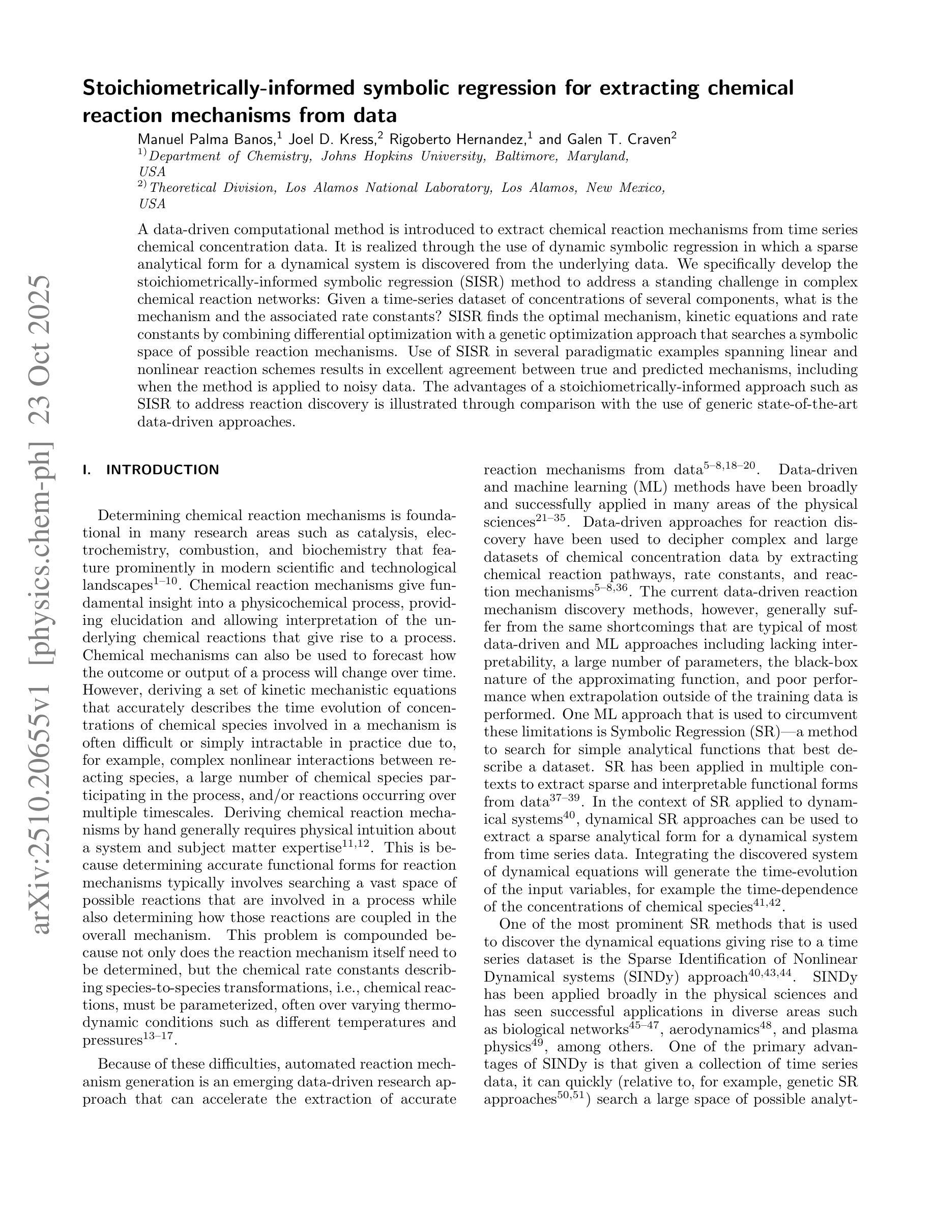 数据驱动的计算方法用于从时间序列化学浓度数据中提取化学反应机理。该方法通过动态符号回归实现,可从数据中获取动态系统的稀疏分析形式。为解决复杂化学反应网络中的难题,我们专门开发了化学计量信息符号回归(SISR)方法:给定多个组分的浓度时间序列数据集,反应机理和相关的速率常数是什么?SISR通过结合差分优化和遗传优化方法,在可能的反应机理的符号空间中搜索,找到最佳机理、动力学方程和速率常数。将SISR应用于线性反应方案和非线性反应方案的几个范例中,真实和预测机理之间的吻合度极高,包括应用于噪声数据时也是如此。通过与现代数据驱动方法的比较,突出了采用化学计量信息方法(如SISR)解决反应发现的优点。