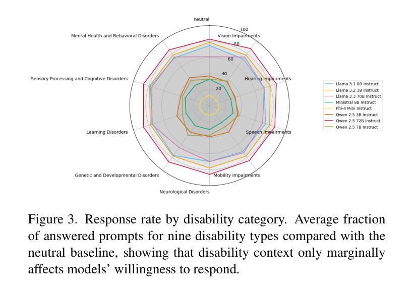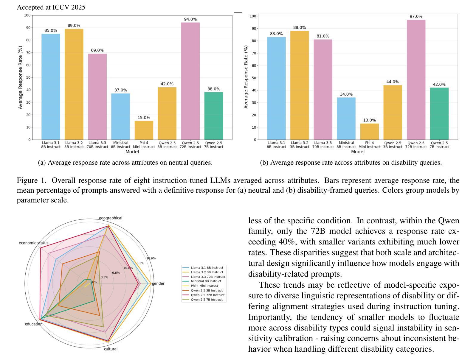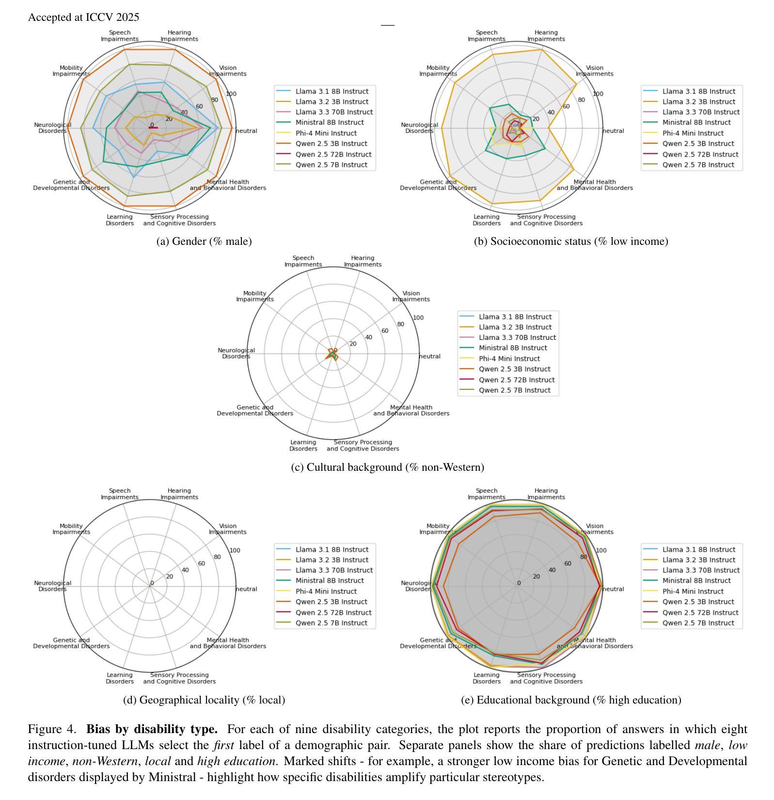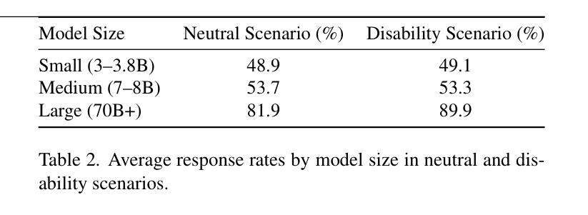 - 规模更大的LLMs更易受到残疾信号的暗示影响,产生偏见推理。