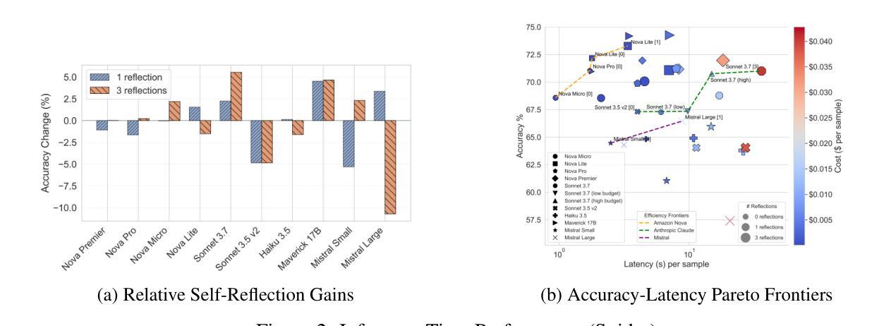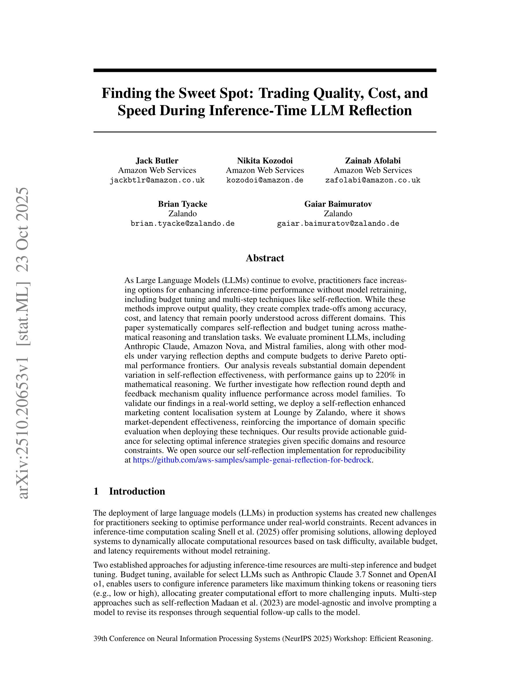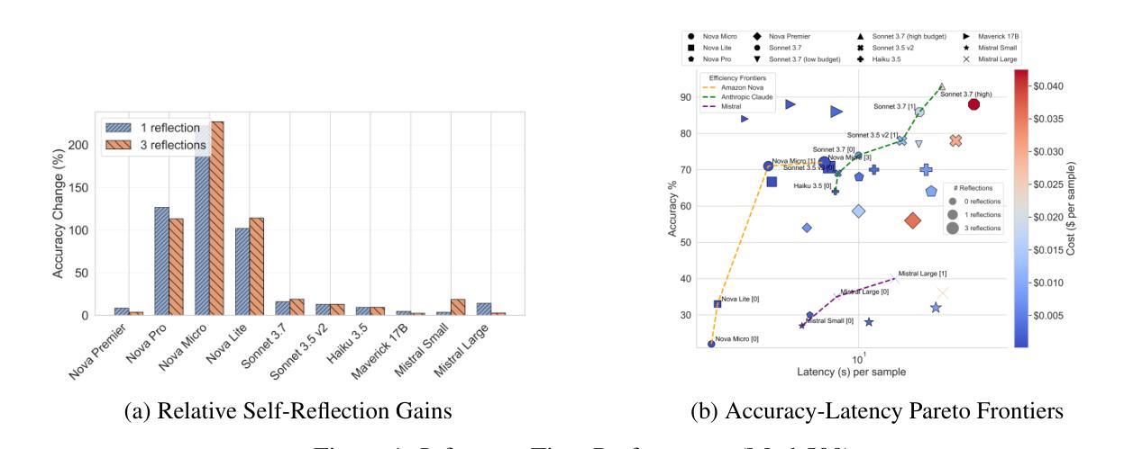 随着大型语言模型(LLM)的不断发展,实践者在不需要模型重新训练的情况下,面临越来越多的提高推理时间性能的选择,包括预算调整和多重步骤技术,如自我反思。虽然这些方法提高了输出质量,但它们也在准确性、成本和延迟之间创造了复杂的权衡,这些权衡在不同领域中的理解仍然不足。本文系统地比较了数学推理和翻译任务中的自我反思和预算调整。我们评估了突出的LLM,包括Anthropic Claude、Amazon Nova和Mistral家族,以及其他模型在不同反射深度和计算预算下,得出帕累托最优性能边界。我们的分析揭示了自我反思效果在领域依赖方面的巨大差异,数学推理的性能提升高达220%。我们还进一步研究了反射回合深度和反馈机制质量对跨模型家族性能的影响。为了在现实世界中验证我们的发现,我们在Zalando的休息室部署了增强自我反思的营销内容本地化系统,该系统显示了市场依赖的有效性,强调了部署这些技术时领域特定评估的重要性。我们的结果提供了在特定领域和资源约束下选择最佳推理策略的可操作指导。我们已将自我反思实现在https://github.com/aws-samples/sample-genai-reflection-for-bedrock上开源,以确保可重复性。