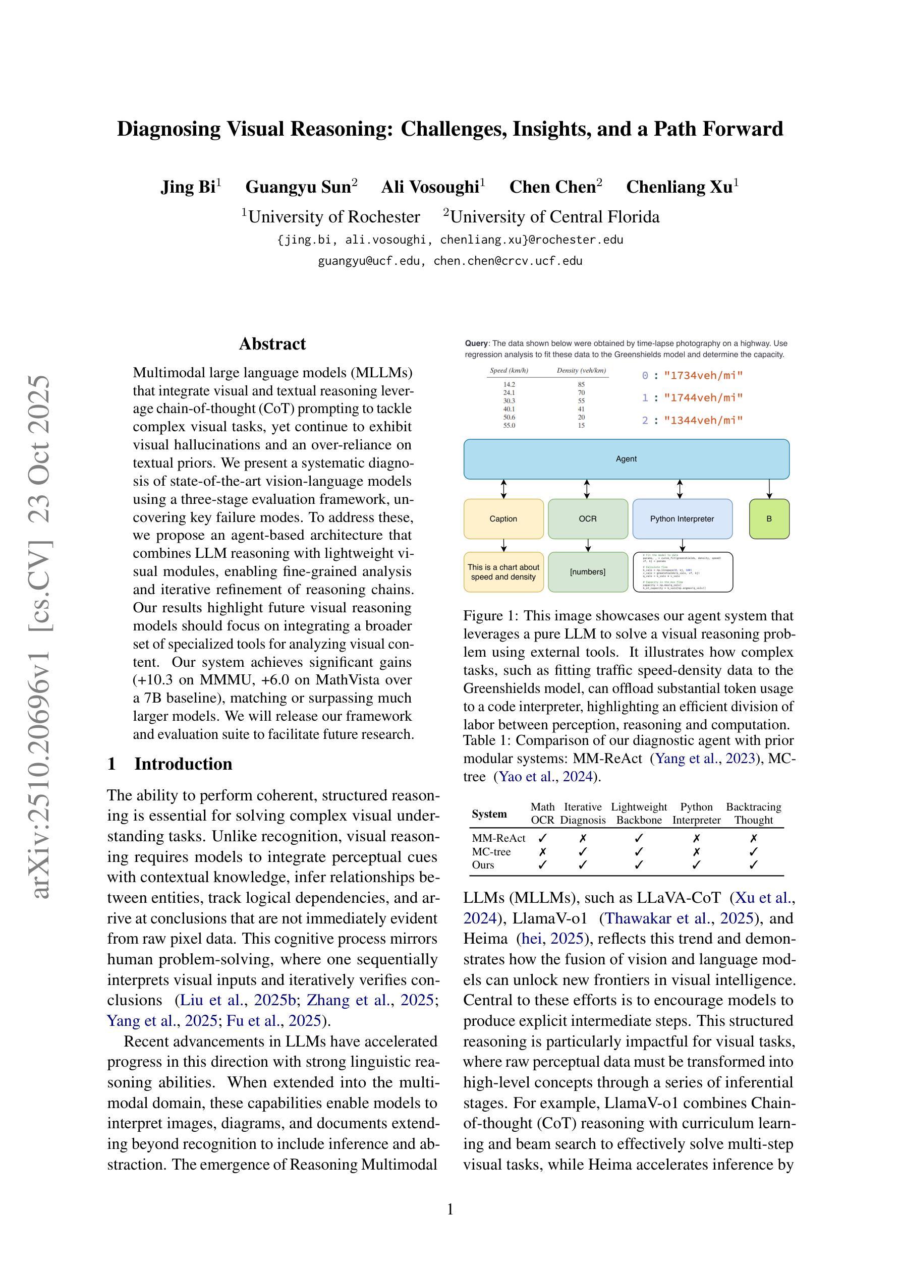 多模态大型语言模型(MLLMs)融合了视觉和文本推理,利用思维链(CoT)提示来解决复杂的视觉任务,但仍然会出现视觉幻觉,过度依赖文本先验知识。我们使用一个三阶段评估框架对最先进的视觉语言模型进行了系统诊断,揭示了关键的失败模式。为了解决这些问题,我们提出了一种基于代理的架构,它将LLM推理与轻量级视觉模块相结合,实现对推理链的精细分析以及迭代优化。我们的结果强调,未来的视觉推理模型应侧重于集成更多用于分析视觉内容的专用工具集。我们的系统在MMMU上取得了显著的改进(提高10.3个点),在MathVista上超过基线模型7B 6个点,性能与更大的模型相匹配甚至超过它们。我们将发布我们的框架和评估套件,以促进未来的研究。