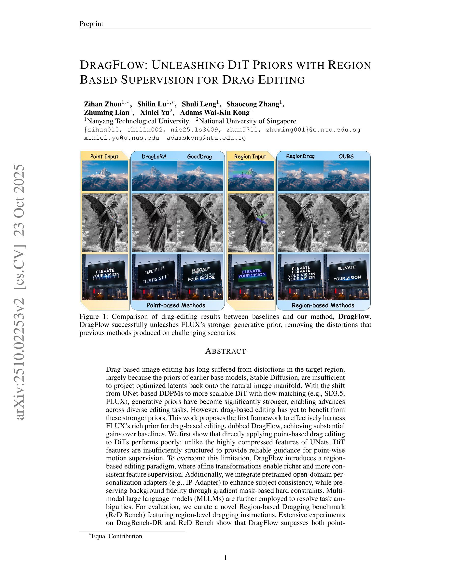 本研究提出了一个利用Flux丰富的先验知识的框架,用于基于拖放的图像编辑,称为DragFlow。该框架实现了对基线方法的显著改进。直接应用点基拖放编辑到DiTs效果较差,因此DragFlow引入基于区域的编辑模式,通过仿射变换实现更丰富和一致的特征监督。结合预训练的开放域个性化适配器(如IP-Adapter)解决任务模糊性。在区域级拖放指令的基准测试(ReD Bench)上进行广泛实验,证明DragFlow超越了点基和区域基的基线方法,在基于拖放的图像编辑领域达到最新状态。