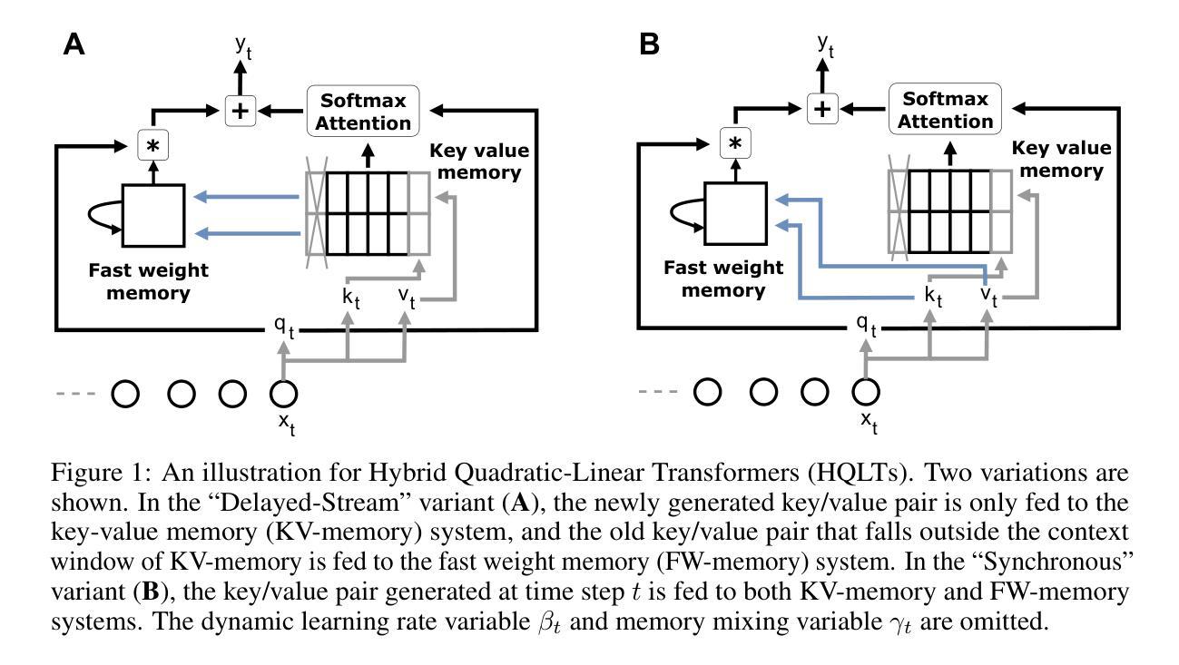 我们为通用序列处理神经网络开发混合内存架构,该架构结合了使用softmax注意力的键值内存(KV-内存)和通过动态突触调制实现的快速权重内存(FW-内存)——分别是二次和线性变压器的核心原理。这两种记忆系统具有互补但单独受限的特性:KV-内存提供精确检索,但受限于序列长度的二次复杂性;而FW-内存支持任意长度的序列,能够实现更富有表现力的计算,但牺牲了精确回忆。我们提出了三种将这两种系统融合成单一内存系统的方法,这些方法在将输入信息传递给每个系统的方式和时机上有所不同,以充分利用两者的优势。我们通过从头开始训练3.4亿参数和13亿参数的模型,以及通过设计用于精确说明某种混合方法相对于其他方法的优势的合成算法任务来进行实验,来验证我们的混合记忆系统在一般语言建模和检索任务上的表现。我们还评估了我们的混合记忆系统在部分可观察环境中的强化学习表现。总的来说,我们展示了精心设计的混合系统如何克服其单个组件的限制,为神经网络系统的设计原则提供了新的见解。