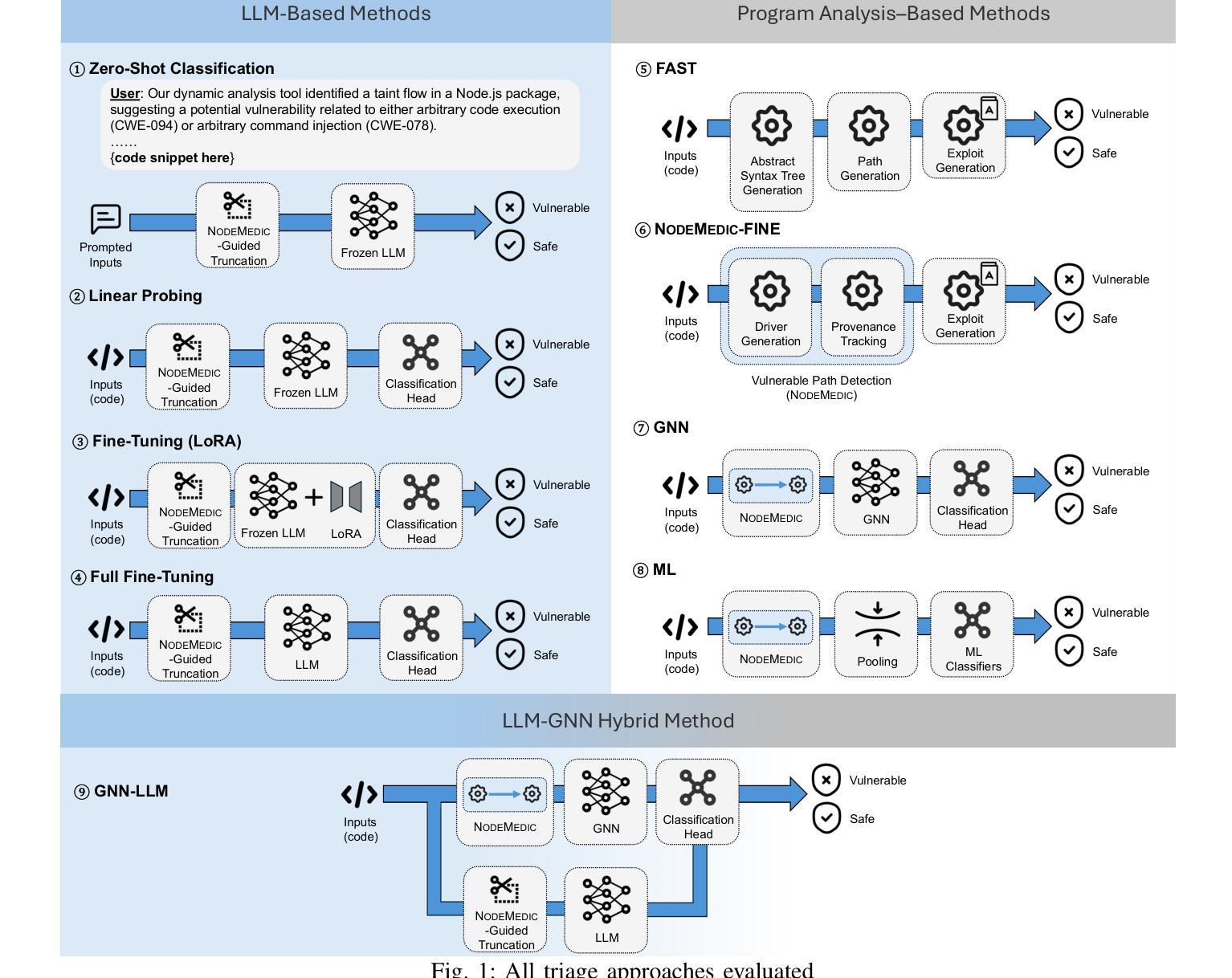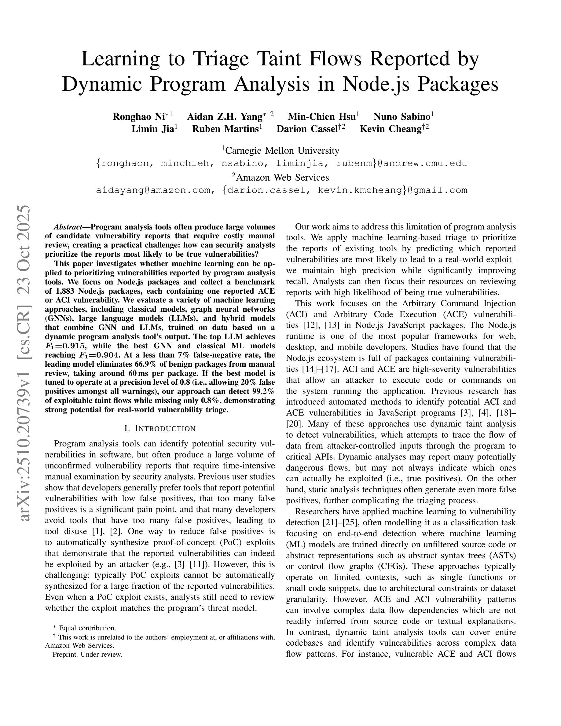 Summary:本文研究了如何利用机器学习技术处理程序分析工具产生的大量候选漏洞报告,以帮助安全分析师优先处理最有可能为真实漏洞的报告。通过对Node.js包的基准测试,结合大型语言模型(LLMs)和图神经网络(GNNs)等机器学习技术,实现了一种有效的漏洞报告优先级排序方法。顶级LLM模型的F1得分达到0.915,能够在减少误报的同时,显著提高分析效率。