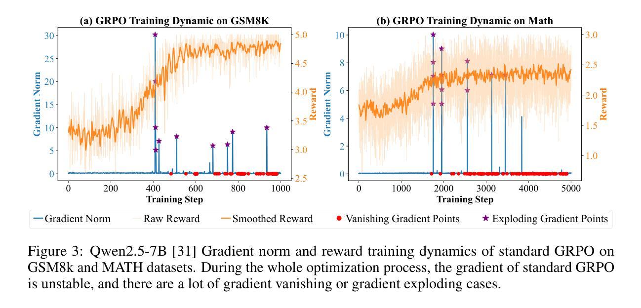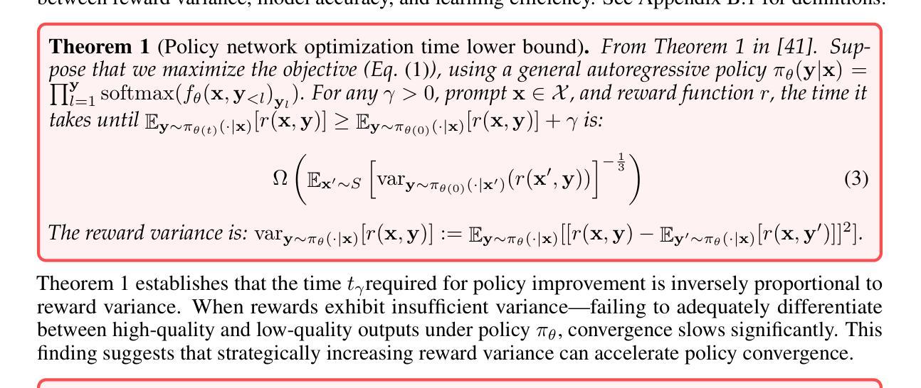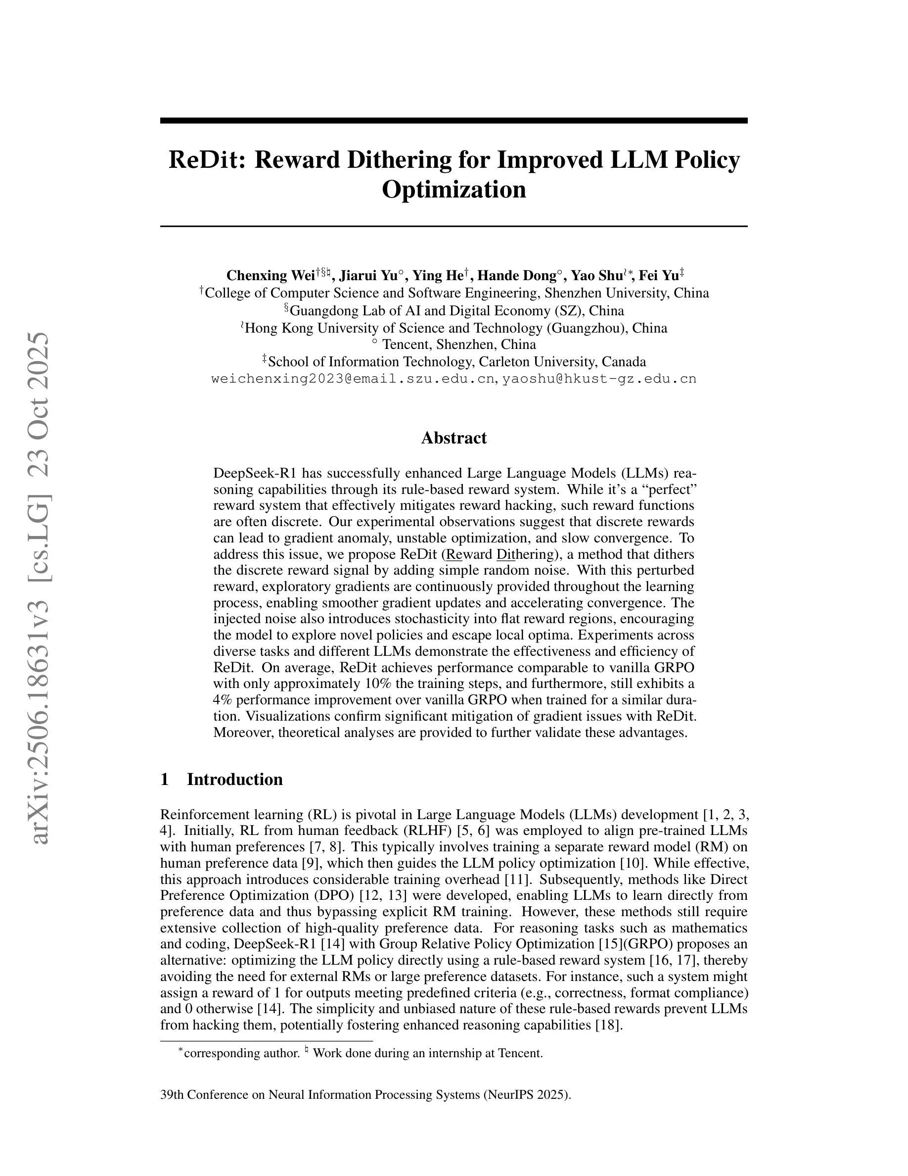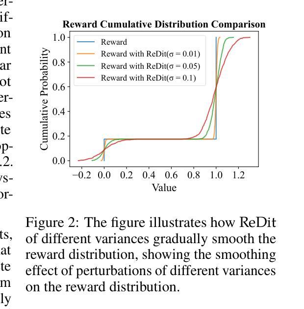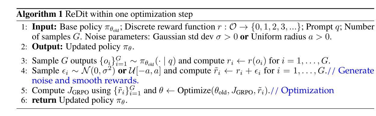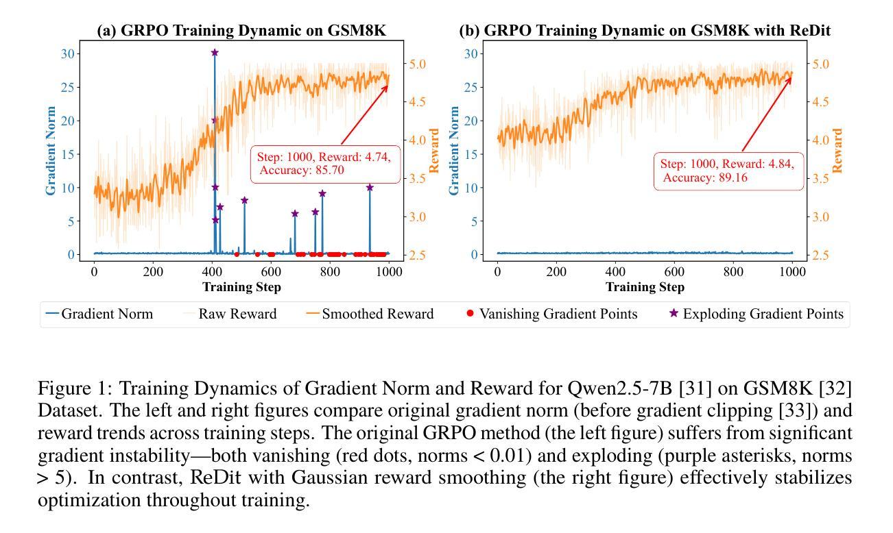 强化器信号加入随机噪声对离散奖励进行处理后成功提高了模型的收敛速度和性能。ReDiT(奖励抖动)方法通过在奖励信号中添加简单随机噪声来抖动离散奖励信号,从而提供持续探索梯度,平滑梯度更新并加速收敛过程。在广泛的任务测试中证明了ReDiT的有效性,与传统GRPO相比具有优势。通过对奖励系统的扰动操作使得模型探索新型策略,从而摆脱局部最优解问题。实验表明,相较于传统GRPO算法,ReDiT算法不仅实现了更高效的训练过程,还在相似的训练时长内实现了平均性能提升。可视化结果表明ReDiT成功缓解了梯度问题,同时也获得了理论分析验证的支持。它不仅适用于许多具体场景的实际问题解决方案的实现与完善发展模型的不断调整更新中的一部分与需要精细化运营的常见实际问题场景中大有裨益而且也得到了用户对其体验的普遍认可和赞扬褒奖。”在一定程度上拥有很大潜能等待发掘解决大规模的业务数据深度应用处理等相关的现实问题发挥显著的作用可作为一种前沿高效的系统实现强有力的解决方案以满足不断提升的需求问题并具有实际价值的极高实践潜力该技术的发展可以视为促进未来的相关领域的关键力量核心技术和产业优化发展的重要推手行业之中的焦点聚点尤其前景潜力较为看好解决数据质量问题亦有一定应用价值贡献推动大规模数据集上的实用性与大规模智能时代的到来助力突破式技术变革对诸多行业具有巨大价值推动技术进步与社会发展产生积极影响助力大数据行业高速发展以及创新技术的进一步应用和发展为社会发展注入新的活力。然而它仍然面临诸多挑战和问题需要进一步研究和解决。未来随着技术的不断进步和应用的深入将会有更多的突破和发展潜力可将其应用在众多重要领域为解决一些实际业务问题和痛点带来新的可能性和创新思路。总的来说ReDiT作为一种创新的解决方案在大数据处理领域具有广阔的应用前景和巨大的发展潜力值得进一步研究和应用推广。这种将神经网络学习模型和物理世界的认知结合的非常巧妙想法或应用将成为大数据时代的最新宠儿有着广泛的探索和研究价值并在实际中有着广泛的应用前景和价值意义将会得到广泛的关注和不断的发展应用推广以及持续的技术创新和改进升级成为未来大数据领域的重要发展方向之一。