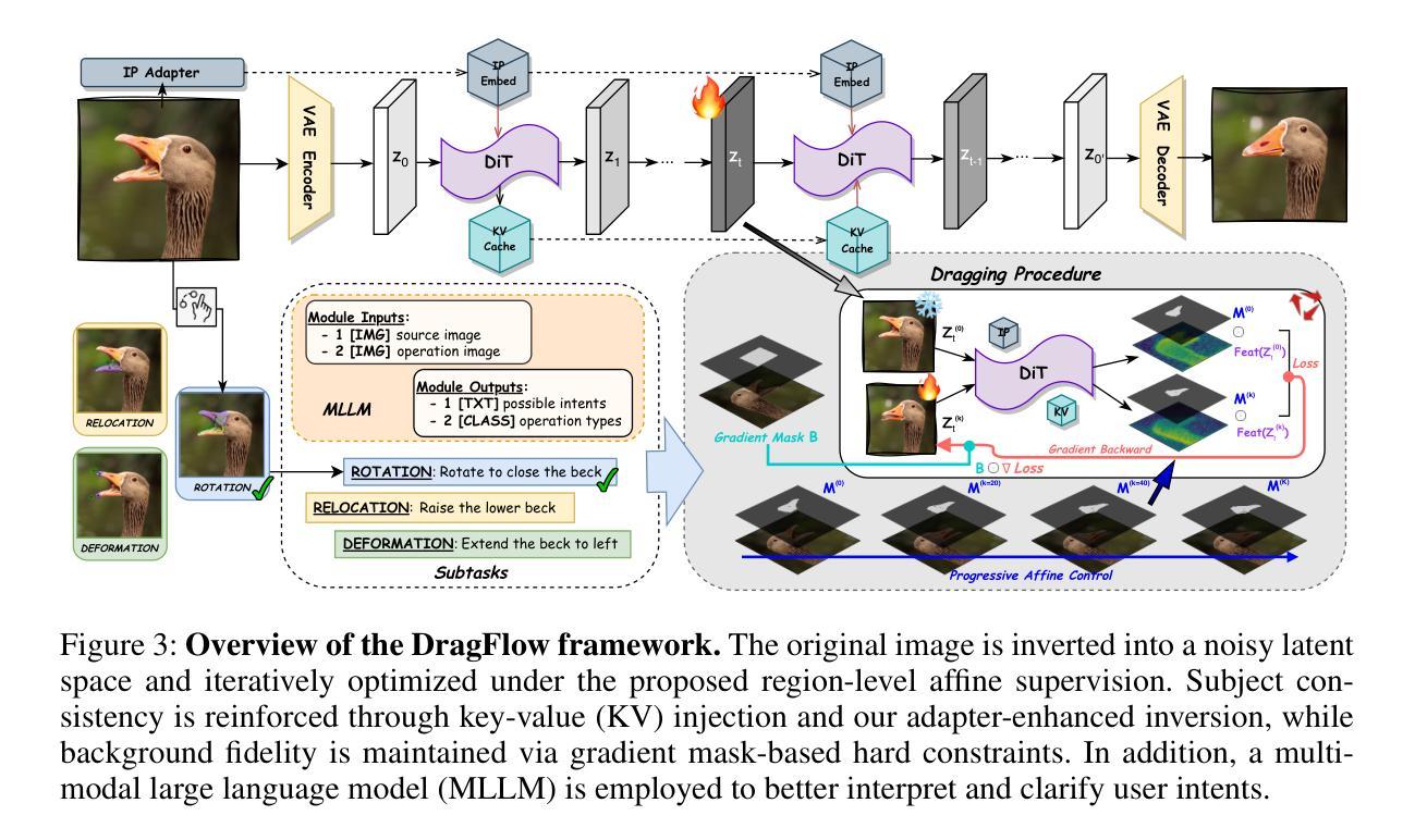 我们首先展示直接将基于点的拖动编辑应用于DiTs表现不佳:与UNet的高度压缩特征不同,DiT的特征结构不够充足,无法为点式运动监督提供可靠的指导。为了克服这一局限性,DragFlow引入了一种基于区域的编辑模式,其中仿射变换使特征监督更加丰富和一致。此外,我们集成了预训练的开放域个性化适配器(例如IP-Adapter)以增强主题一致性,同时通过基于梯度掩码的硬约束保留背景保真度。还进一步采用了多模态大型语言模型(MLLMs)来解决任务歧义。