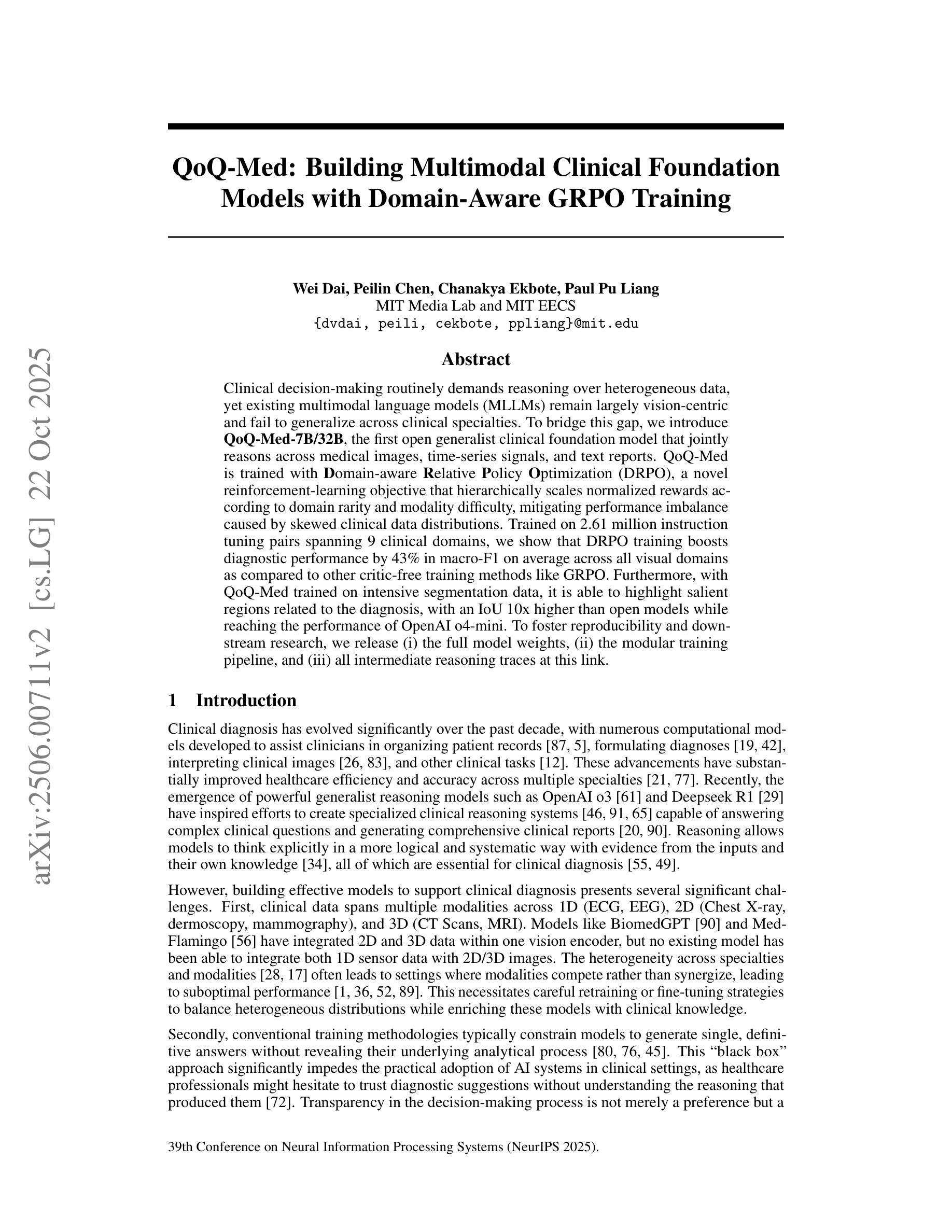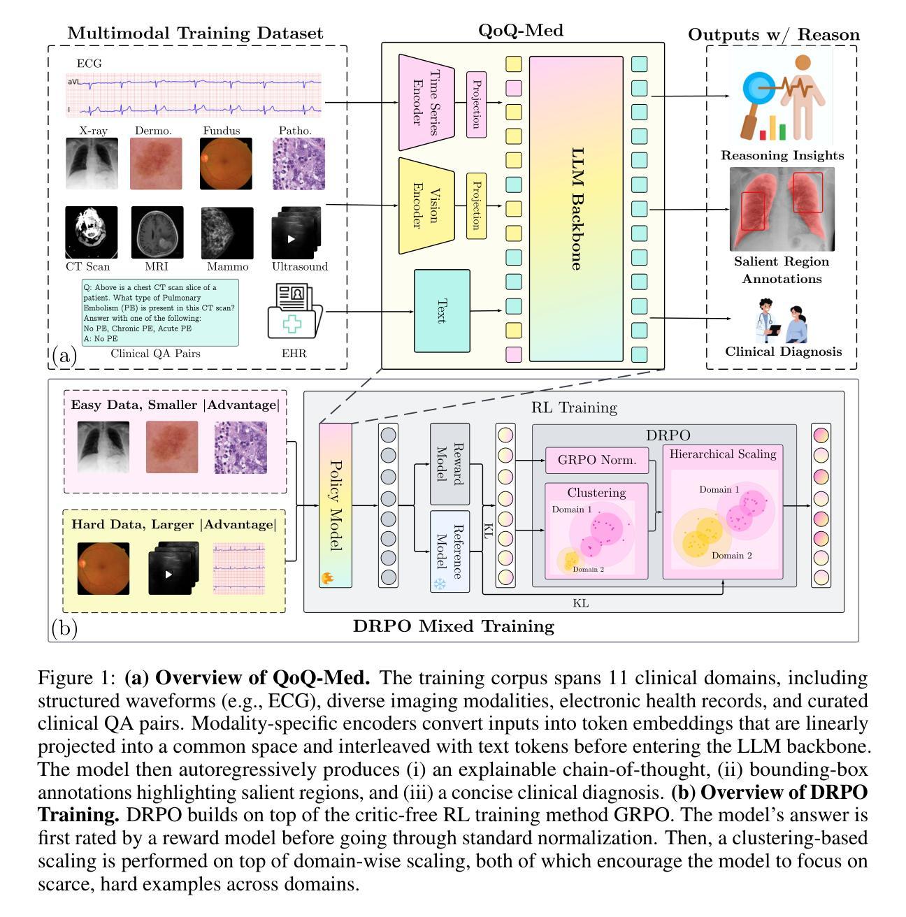 临床决策通常需要处理各种异质数据。然而,现有的多模态语言模型(MLLMs)仍然主要侧重于视觉领域,无法在临床各科之间实现通用化。为了弥补这一差距,我们推出了QoQ-Med-7B/32B,这是第一个开放的临床基础模型,可以联合处理医学图像、时间序列信号和文本报告。QoQ-Med采用领域感知的相对策略优化(DRPO)进行训练,这是一种新型强化学习目标,按领域稀有性和模态难度分层缩放标准化奖励,从而缓解由倾斜的临床数据分布导致的性能不平衡问题。在涵盖9个临床领域的261万个指令调整对数据对上进行训练,我们证明,与其他无批判训练方法(如GRPO)相比,DRPO训练在平均宏观F1得分上提高了43%的诊断性能。此外,使用QoQ-Med在密集分割数据上进行训练后,它能够突出显示与诊断相关的关键区域,其IoU值高出开放模型的十倍以上,同时达到OpenAI o4-mini的性能水平。为了促进可重复性和下游研究,我们在https://github.com/DDVD233/QoQ_Med上发布了(i)完整的模型权重,(ii)模块化训练管道和(iii)所有中间推理跟踪。