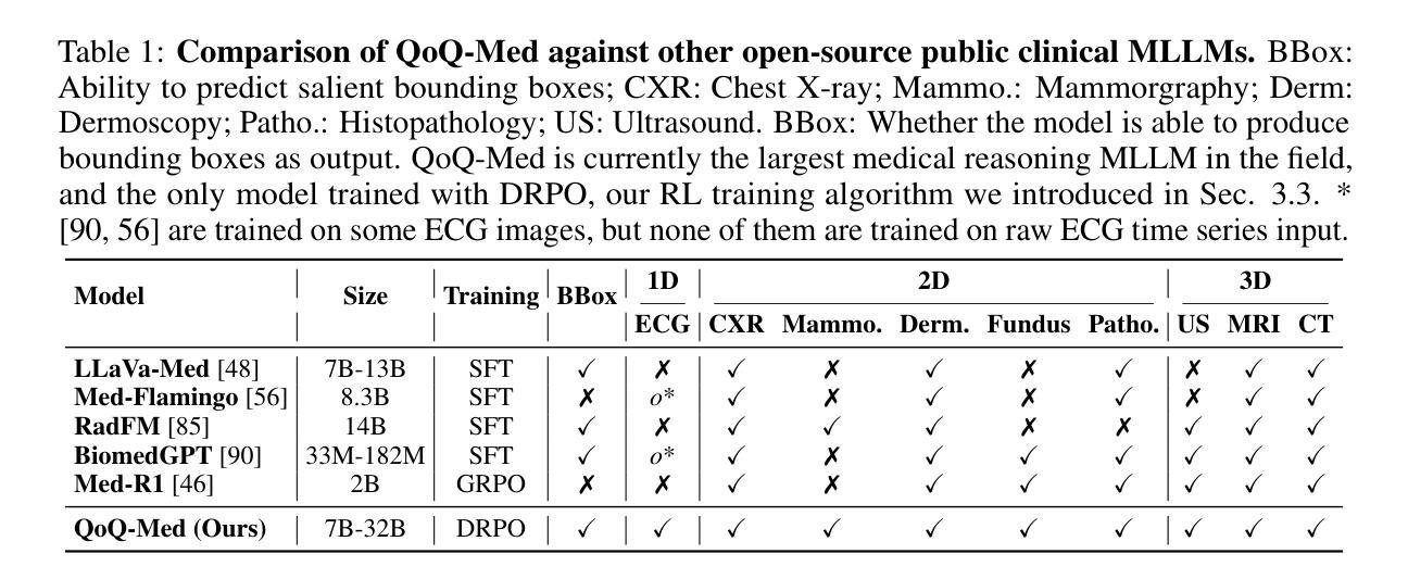 - QoQ-Med是首个开放的临床通用基础模型,支持跨医学图像、时间序列信号和文本报告的联合推理。