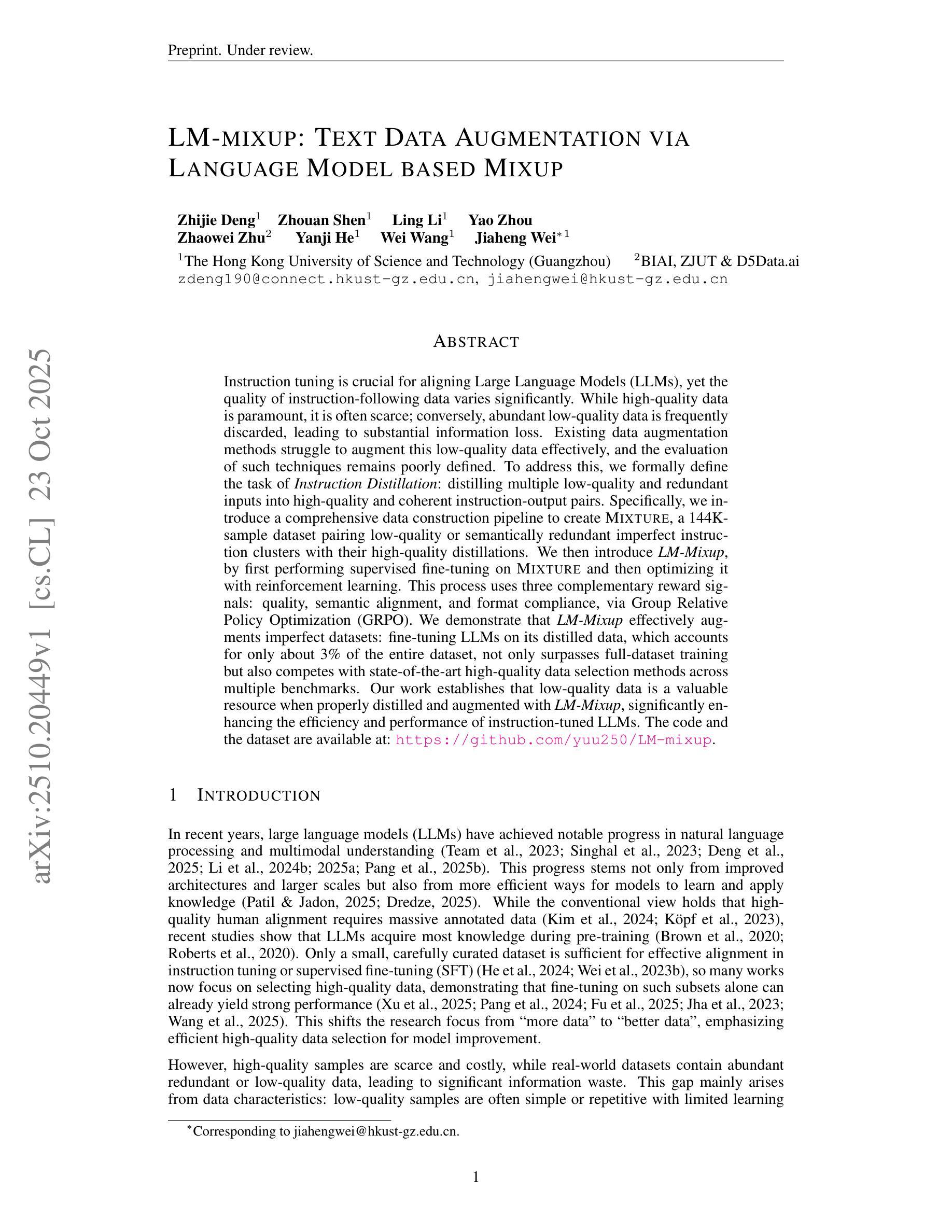 指令调整对于对齐大型语言模型(LLM)至关重要,但指令遵循数据的质量差异很大。虽然高质量数据至关重要,但它往往很稀缺;相反,大量低质量数据经常被丢弃,导致大量信息丢失。现有的数据增强方法难以有效地增强这种低质量数据,而且对这些技术的评估定义尚不清楚。为了解决这个问题,我们正式定义了指令蒸馏的任务:将多个低质量和冗余的输入蒸馏成高质量和连贯的指令-输出对。具体来说,我们引入了一个全面的数据构建流程来创建MIXTURE,这是一个拥有14万样本的数据集,将低质量或语义上冗余的不完美指令集群与它们的高质量蒸馏配对。然后,我们引入了LM-Mixup,首先使用MIXTURE进行有监督微调,然后使用强化学习进行优化。这一过程使用三种互补的奖励信号:质量、语义对齐和格式合规性,通过群体相对策略优化(GRPO)。我们证明LM-Mixup可以有效地增强不完美的数据集:在蒸馏数据上微调LLM(仅占整个数据集的3%),不仅超过了全数据集的训练,而且在多个基准测试上与国家最先进的优质数据选择方法相竞争。我们的工作证明,当适当蒸馏和用LM-Mixup增强时,低质量数据是一种有价值的资源,可以显著提高指令调整型LLM的效率和性能。