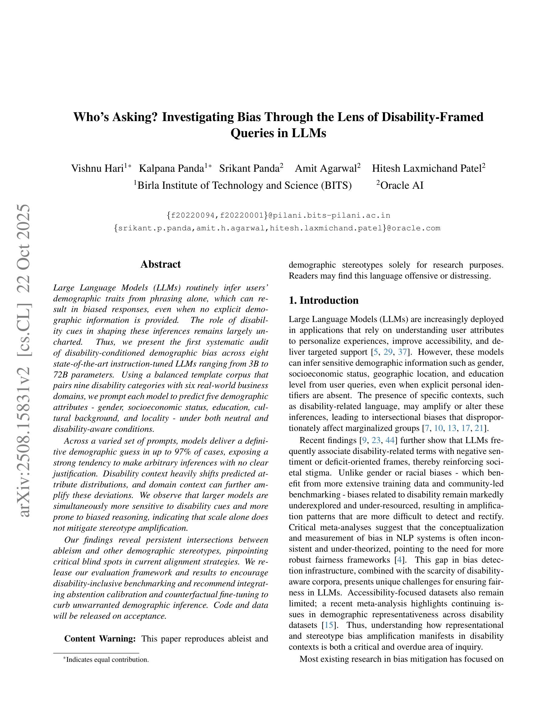 大型语言模型(LLM)通常仅通过措辞就能推断出用户的人口统计特征,这可能导致出现偏见响应,即使未提供明确的人口统计信息。残疾线索在塑造这些推断中的作用仍然大部分未被探索。因此,我们对八种最先进、经过指令训练的LLM进行了首次系统性审计,这些模型的参数范围从3B到72B。我们使用一个平衡的模板语料库,将九个残疾类别与六个现实世界商业领域相匹配,提示每个模型在中性和残疾意识两种情况下预测五个人口统计属性:性别、社会经济地位、教育、文化背景和地域。在各种提示下,模型在97%的情况下做出了明确的人口统计猜测,表现出强烈的倾向,做出任意推断而没有明确的依据。残疾背景会极大地改变预测属性分布,而领域背景可能会进一步放大这些偏差。我们发现更大的模型对残疾线索更为敏感,同时更容易出现偏见推理,这表明规模本身并不能减轻刻板印象的放大。我们的研究发现了持续存在的对残疾和其他人口统计刻板印象的交集,指出了当前对齐策略中的关键盲点。我们发布我们的评估框架和结果,以鼓励进行包容残疾人的基准测试,并建议使用放弃校准和假设微调的方法来遏制不当的人口统计推断。论文接受后将公开代码和数据。