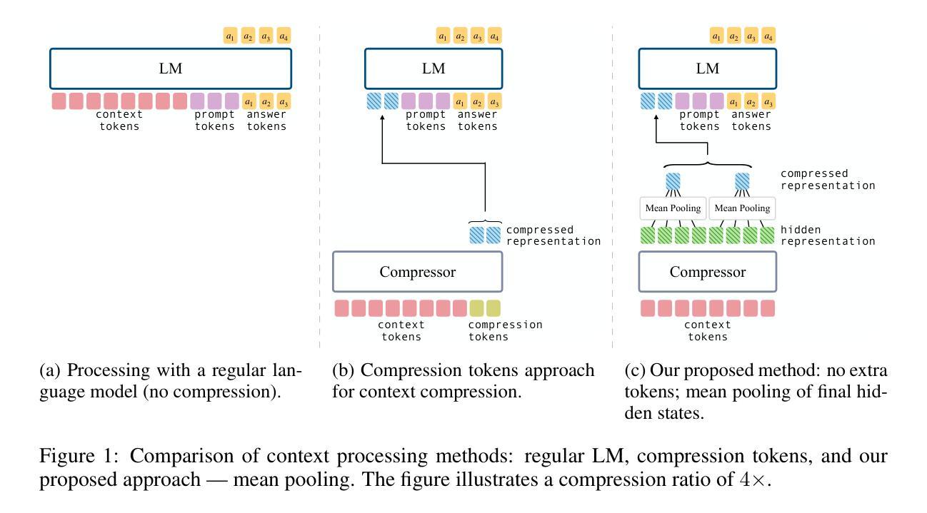 - 研究团队提出了一种新的平均池化方法,该方法在压缩上下文方面表现优于广泛使用的压缩令牌架构。